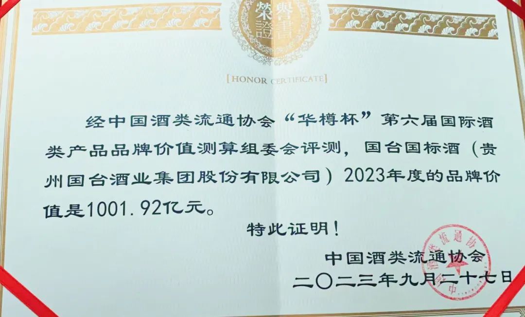 9月27日,“华樽杯”第十五届中国酒业 200 品牌价值发布会在北京举行。评议组委会评测结果显示,国台品牌价值再创新高,以2062.68亿元稳居中国白酒第十名、贵州省白酒第三名;国台国标酒单品品牌价值突破千亿,达1001.92亿元,位列全球酒类产品白酒类第九名。
