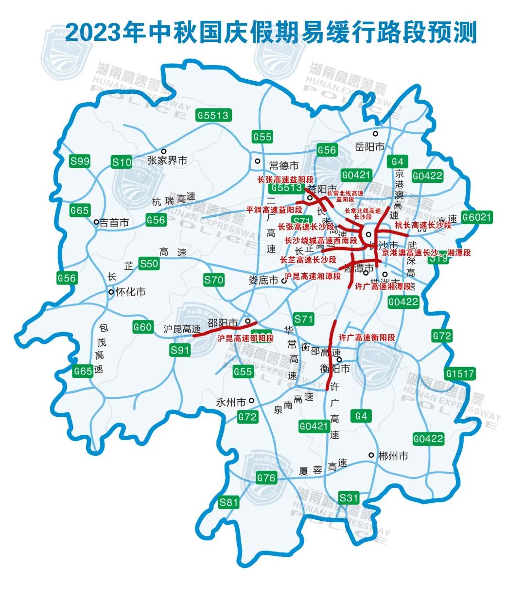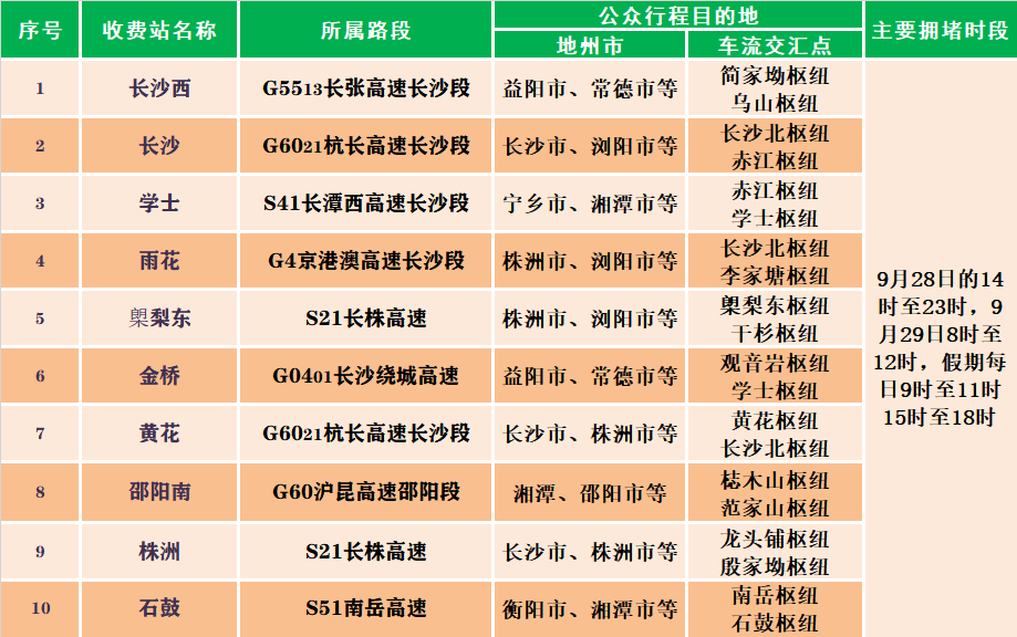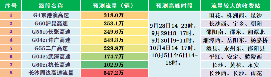 G4京港澳高速长沙段、湘潭段;G60沪昆高速湘潭段、邵阳段;G5513长张高速长沙段、益阳段;G0401长沙绕城高速西南段;G0421许广高速湘潭段、衡阳段;G5517长常北线高速长沙段、益阳段;G6021杭长高速长沙段;S20平洞高速益阳段;S50长芷高速长沙段。拥堵时段预测:9月28日(14:00至22:00),9月29日(8:00至17:00),9月30日(9:00至11:00),10月4日(14:00至17:00),10月5日和6日(14:00至18:00)。建议途经以上高速路段的车主,注意错时避峰出行,如遇缓行或拥堵,请保持安全车距,不要随意穿插加塞,耐心等候,有序、依次通行。(1)长沙境内(24个):G5513长张高速长沙西、宁乡;G6021杭长高速长沙、黄花、三一、永安;G4京港澳高速雨花、星沙;S41长潭西高速学士;S21长株高速㮾梨东;S19浏洪高速浏阳西;G0401长沙绕城高速金桥、洞井、新港、黄花塘、万家丽南、坪塘、捞刀河、万家丽北、长龙、星城、白竹、望城经开区、大托。(2)邵阳境内(5个):G60沪昆高速邵阳南、邵东、邵阳东、隆回、洞口;(3)湘潭境内(4个):G60沪昆高速湘潭北、湘乡,S41长潭西高速九华、G0421许广高速杨嘉桥。(4)常德境内(4个):G5513长张高速太子庙,G55二广高速常德东、澧县,G56杭瑞高速常德西;(5)衡阳境内(4个):G4京港澳高速耒阳,S51南岳高速石鼓、南岳,G72泉南高速雁峰;(6)株洲境内(3个):G4京港澳高速株洲西,S21长株高速株洲,S52醴易高速白关。(7)其他地(州)市:岳阳境内(2个)G0421许广高速岳阳东,G0422武深高速平江;益阳境内(2个)G5513长张高速益阳、幸福渠;怀化境内(3个)G65包茂高速怀化西,S97怀化绕城高速怀化南,S50长芷高速怀化北;娄底境内(3个)S70娄新高速娄底西、新化,S50长芷高速娄底;郴州境内(1个)G4京港澳高速郴州;湘西境内(2个)G56杭瑞高速凤凰站、吉首站;张家界境内(2个)G5513长张高速张家界、张家界西。永州境内(1个)G55二广高速永州东收费站。(1)预测中秋国庆假期,服务区车流客流增幅较大,“潮汐”拥堵特征明显。客流较大的服务区有:G0421许广高速沿线服务区(14个):宜章西、临武、欧阳海、常宁、雨母山、峡山口、石市、高真寺、射埠、道林、雷锋、湘阴、荣家湾、岳阳服务区。G4京港澳高速沿线服务区(14个):小塘、宜章、苏仙、永兴、耒阳、冠市、雁城、衡山、朱亭、昭山、平江、大荆、临湘、羊楼司服务区。G60沪昆高速沿线服务区(8个):醴陵、湘潭、湘乡东、水府庙、邵东、宝庆、隆回、洞口服务区G5513长张高速(2个)长沙段的宁乡、太子庙服务区;G5517长常北线高速(1个)长沙段的长沙西服务区;S20平洞高速(1个)益阳段益阳南服务区。拥堵时段:9月28日14时至23时,假期每日的9时至11时,15时至18时。截至目前,全省高速132对服务区,共计1108个充电车位,路网基本覆盖。G4京港澳高速、G0422武深高速全覆盖;G5513长张高速、G60沪昆高速、G72泉南高速、G76厦蓉高速、G56杭瑞高速高密度布局;G55二广高速、G0421许广高速已布点充电桩。据统计,每日7时以后高速站点充电车辆逐步增加,充电量逐渐上升;13时至18时达到当日充电高峰;19时以后充电车辆逐步减少,充电车辆数量逐渐下降。温馨提示:在服务区充电高峰时段,新能源车可选择就近收费站驶离,打开车载APP搜索附近充电桩位置,APP可根据用户的位置智能地推荐附近的充电站,通过精确的导航迅速到达充电地点。来源:青年湖南综合整理自人民网科普、中国铁路、湖南高速警察投稿信箱:510115641@qq.com(投稿原创被采纳,奖励50元)