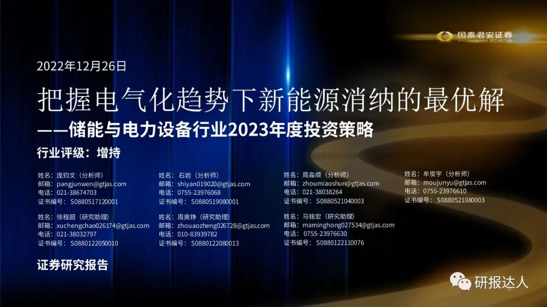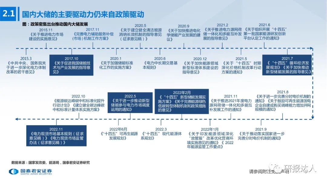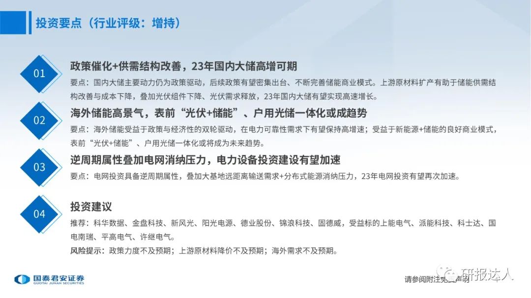 要点:国内大储主要动力仍为政策驱动,后续政策有望密集出台、不断完善储能商业模式。上游原材料扩产有助于储能供需结构改善与成本下降,叠加光伏组件下降、光伏需求释放,23年国内大储有望实现高速增长。