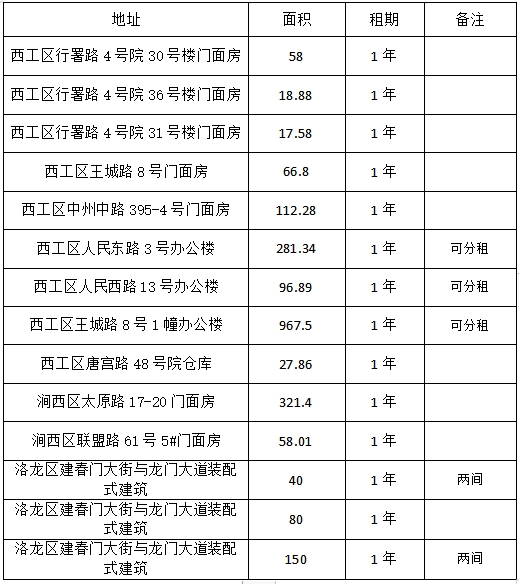 洛阳京洛资产管理有限公司现将部分空置房产进行公开招租,房产共14处,建筑面积2296.54㎡。