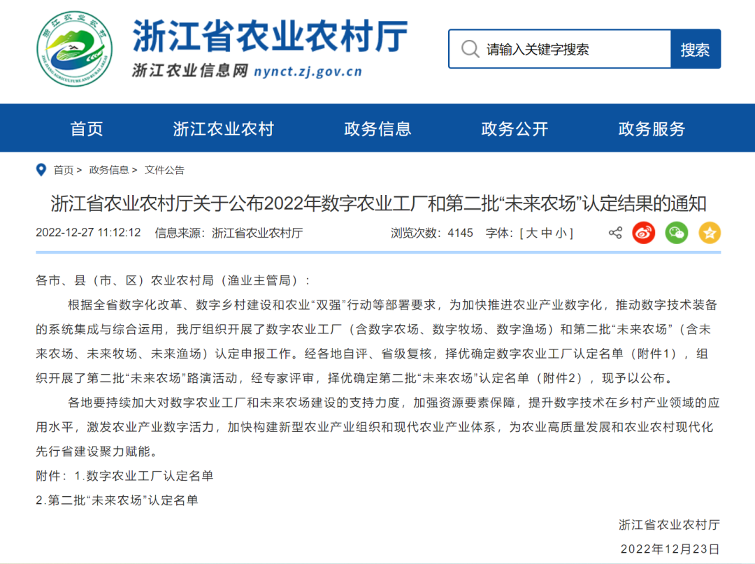 12月27日,《浙江省农业农村厅关于公布2022年数字农业工厂和第二批“未来农场”认定结果的通知》发布,其中,浙江骆驼九宇有机食品有限公司的九宇抹茶数字农业工厂、杭州正浩富梅茶叶有限公司的正浩富梅龙井茶数字农业工厂、安吉龙王山茶叶开发有限公司的龙王山茶叶数字农业工厂、绍兴御茶村茶业有限公司的御茶村有机抹茶数字农业工厂、浙江乡雨茶业有限公司的乡雨茶业数字农业工厂5家涉茶企业被认定为2022年浙江省数字农业工厂。