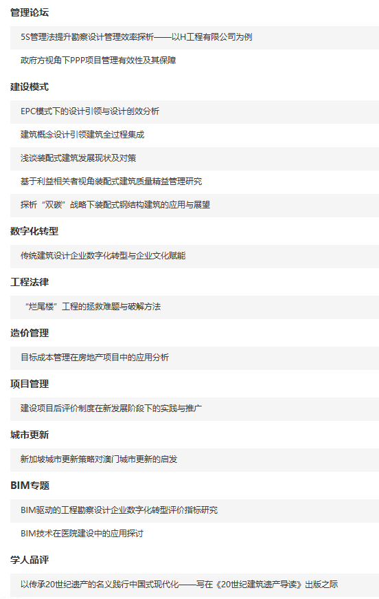 简介:《建筑设计管理》是由国家住房和城乡建设部主管,中国勘察设计协会与中国建筑东北设计研究院有限公司主办的全国建筑设计协会会刊,国内外公开发行的建筑科学类综合性期刊。宗旨是以建筑勘察设计企业管理为核心,围绕勘察设计和建筑企业改革与发展,宣传和交流建筑企业改革与管理、建筑设计与技术方面的新成就、新经验、新技术,推介管理经验与技术成果,为协会广大会员、同行业及相关行业服务。主要栏目:高层声音、政策法规、行业信息、协会工作、管理论坛、封面链接、设计管理、市场营销、项目管理、人力资源、品牌战略、企业文化、建筑设计、城市设计、建筑技术、建筑欣赏。