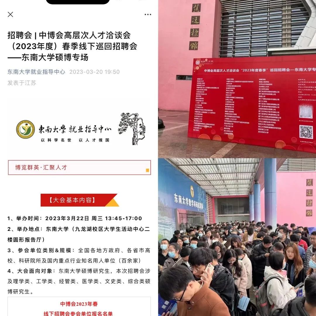 由人力资源和社会保障部全国人才流动中心指导,中全人才、博汇人力资源服务(北京)有限公司共同主办的“中博会高层次人才洽谈会(2023年度)秋季线下巡回招聘会——东南大学硕博专场”将于2023年10月14日在东南大学校内举办。