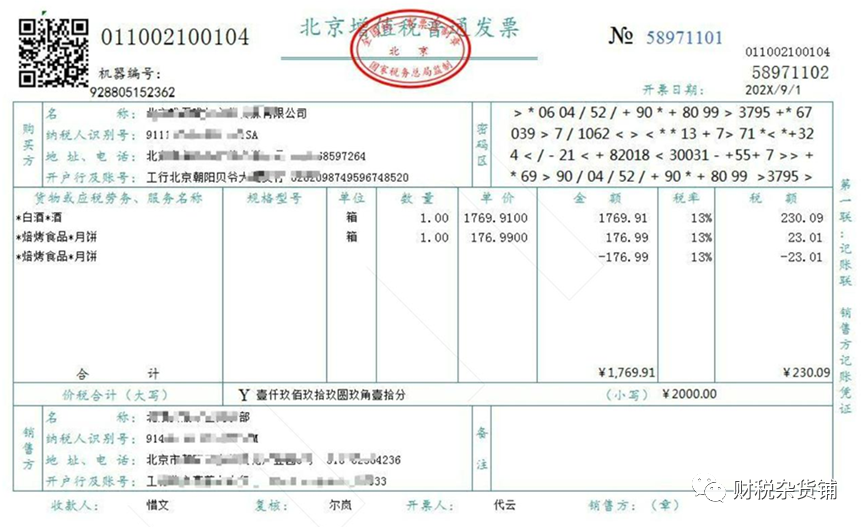 3、企业所得税:赠品不按视同销售处理,176.99 元(不含税)月饼价款不缴纳所得税,而是将总的销售金额按两种商品的公允价值的比例来分摊确认各项的销售收入,即将 1769.91元(2000/1.13)分解为: