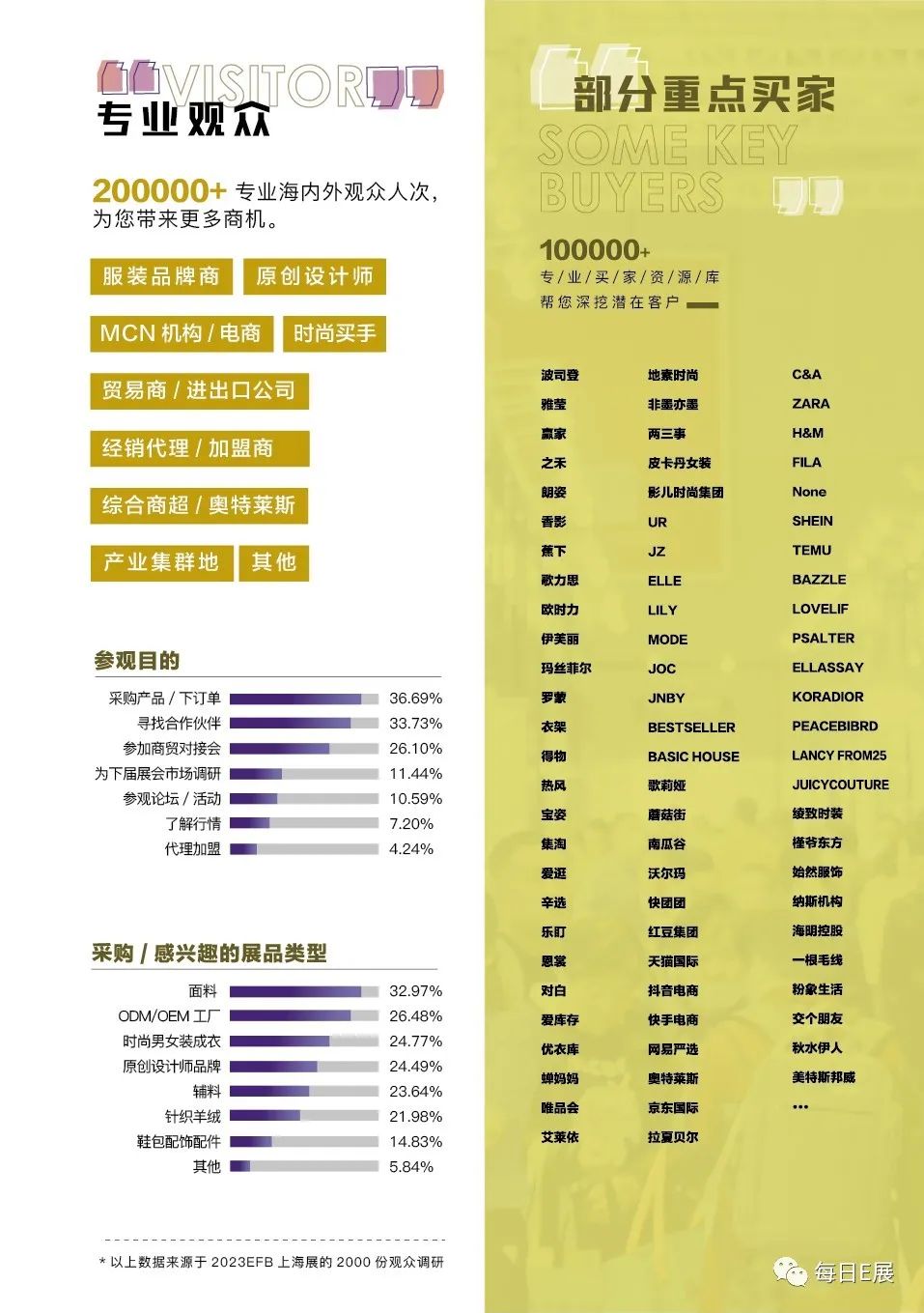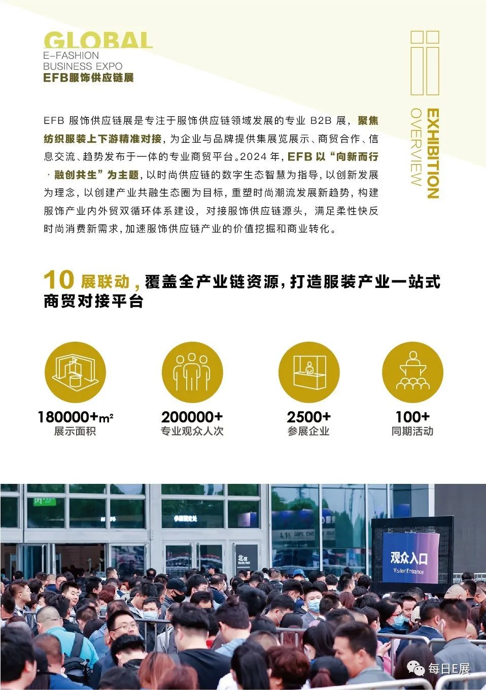 EFB服饰供应链展由全国工商联纺织服装业商会、中国纺织品进出口商会和灵硕展览集团共同举办,系LINK FASHION品牌系列展会之一,作为成熟、专业的服装展会平台,一直深耕于服饰产业链各个环节,积累众多供应链优质资源,合作伙伴覆盖服饰行业各大领域。展会“整合服饰供应链,驱动行业新未来”为核心,贯穿纺织服装服饰产业链上下游,为生产商、品牌商及贸易商提供趋势发布、展览展示、信息交流、商贸合作和获取订单的渠道,展会深度挖掘行业新商机。