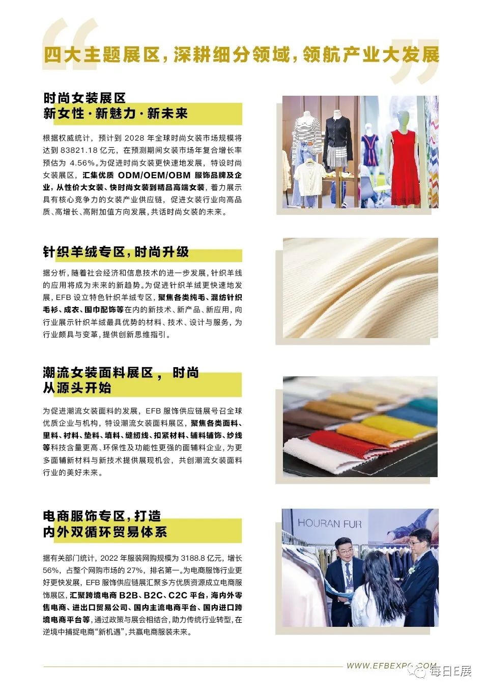 2024EFB上海国际服饰供应链博览会以“向新而行·融创共生”为主题,以时尚供应链的数字生态智慧为指导,以创新发展为理念,以创建产业共融生态圈为目标,重塑时尚潮流发展新趋势,构建服饰产业内外贸双循环体系建设,对接服饰供应链源头,满足柔性快反时尚消费新需求,加速服饰供应链产业的价值挖掘和商业转化。