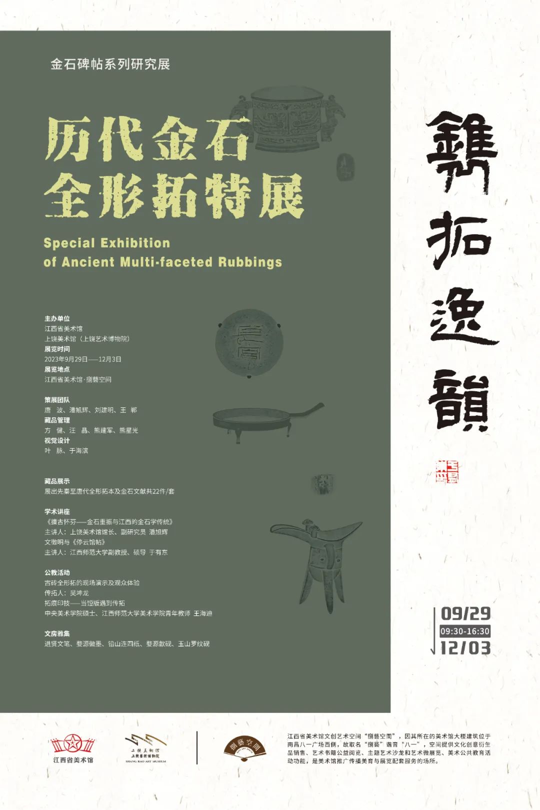 全形拓是中国传拓技艺中独树一帜的传拓方法。随着金石学在清代的复兴,一种画与拓结合的新艺术形式——全形拓在清代中晚期出现了,并成为一种融研究、鉴赏与艺术于一体的文人雅好。全形拓分为“存古”和“取像”两种风格,不同于传统的各式平面拓法,全形拓法能将三维立体的器物转化为二维平面的图像,从视觉效果上,又不失去其立体观感和图像美感。此次展览特汇集不同历史时期的青铜彝器、兵器、量器、陶器、灯具、造像、玺印等器物的全形拓本,是江西省美术馆以“镌拓逸韵”为主题的金石碑帖系列研究展续篇,旨在弘扬中华优秀传统文化,展现金石学范畴的多样性与丰富性,让观众可以感受全形拓的独特魅力。