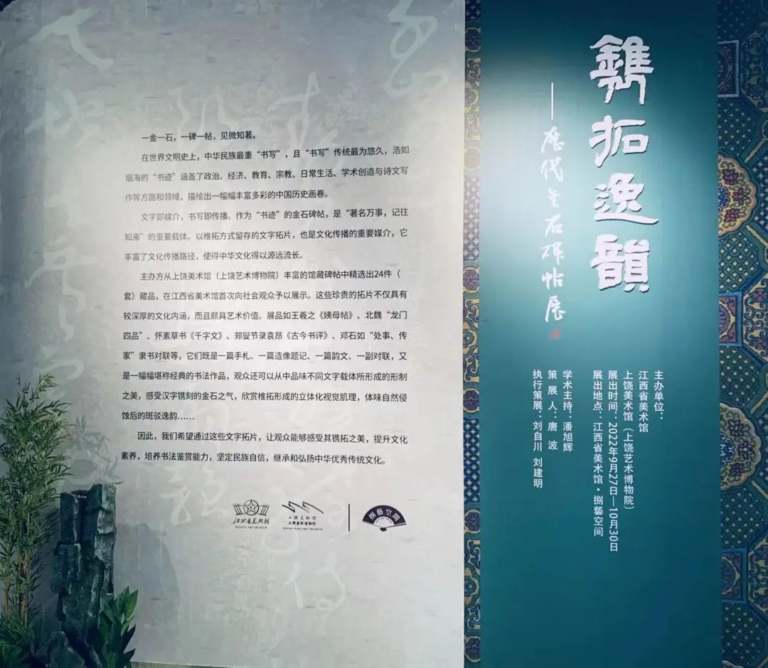 一金一石,一碑一帖,见微知著。由江西省美术馆、上饶市美术馆(上饶艺术博物院)共同主办的“镌拓逸韵——历代金石碑帖展”日前已圆满落下帷幕,24 件(套)自西周、秦、三国、东晋、北魏、唐、宋、元、至明清,涉及三国钟繇,东晋王羲之、王献之,唐代虞世南、颜真卿、怀素,宋代苏轼、蔡京,元代赵松雪,明代傅山、王铎,清代邓石如、郑燮、赵之谦等书法名家的金石碑帖藏品首次在江西省美术馆向社会观众予以展示。现场一幅幅各具形制之美、充满金石之气的碑帖藏品让观众大饱眼福,从中领略到镌拓留存的立体化视觉肌理和自然侵蚀后斑驳逸韵,历经34天的展览吸引了2万余观众的慕名观赏。