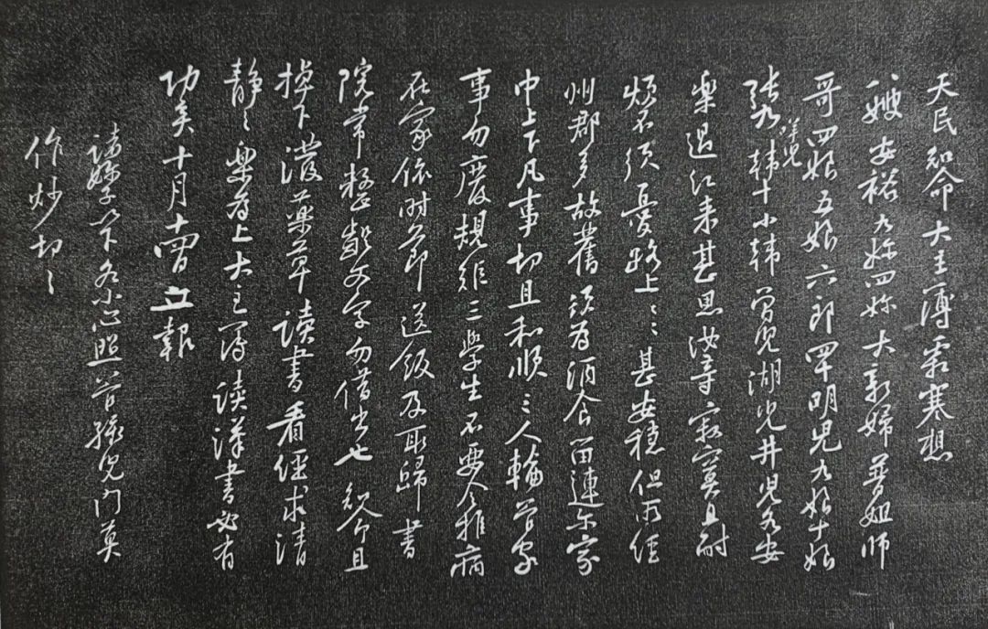 释文:天民、知命、大主簿:霜寒,想八嫂安裕、九妳、四妳、大新婦、普姐、師哥、四娘、五娘、六郎、四十、明兒、九娘、十娘、張九(咩兒)、韓十、小韓、曾兒、湖兒、井兒,各安樂。過江來,甚思汝等,寂寞且耐煩,不須憂路上,路上甚安穩。但所經州郡多故舊,須爲酒食留連爾。家中上下,凡事切且和順。三人輪管家事,勿廢規矩。三學生不要令推病在家,依時節送飯及取歸。書院常整齪、文字勿借出也。知命且掉下潑藥草,讀書看經,求清靜之樂爲上,大主簿讀《漢書》必有功矣。十月十四日,立報。諸嬭子以下,各小心照管孩兒們,莫作炒,切切。