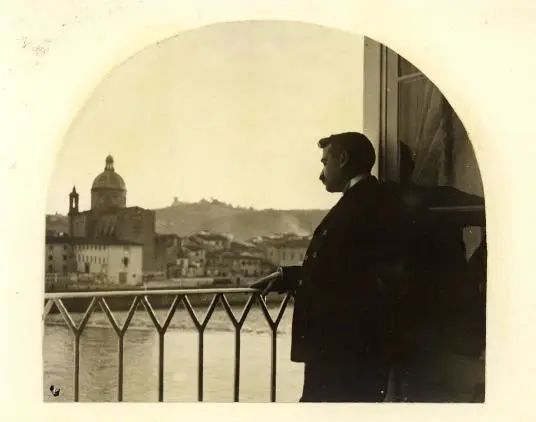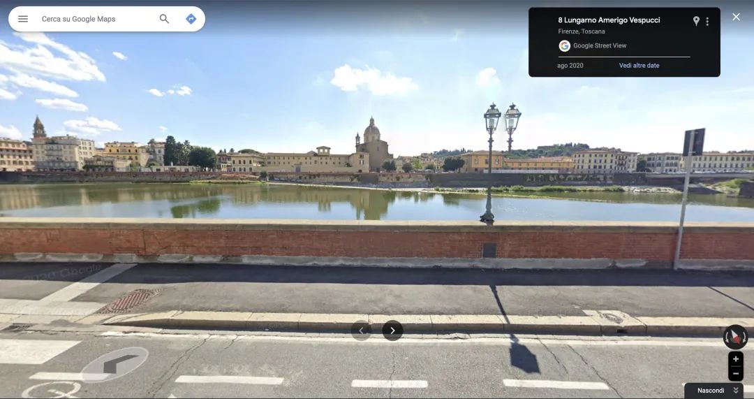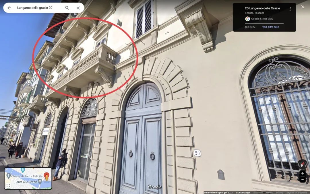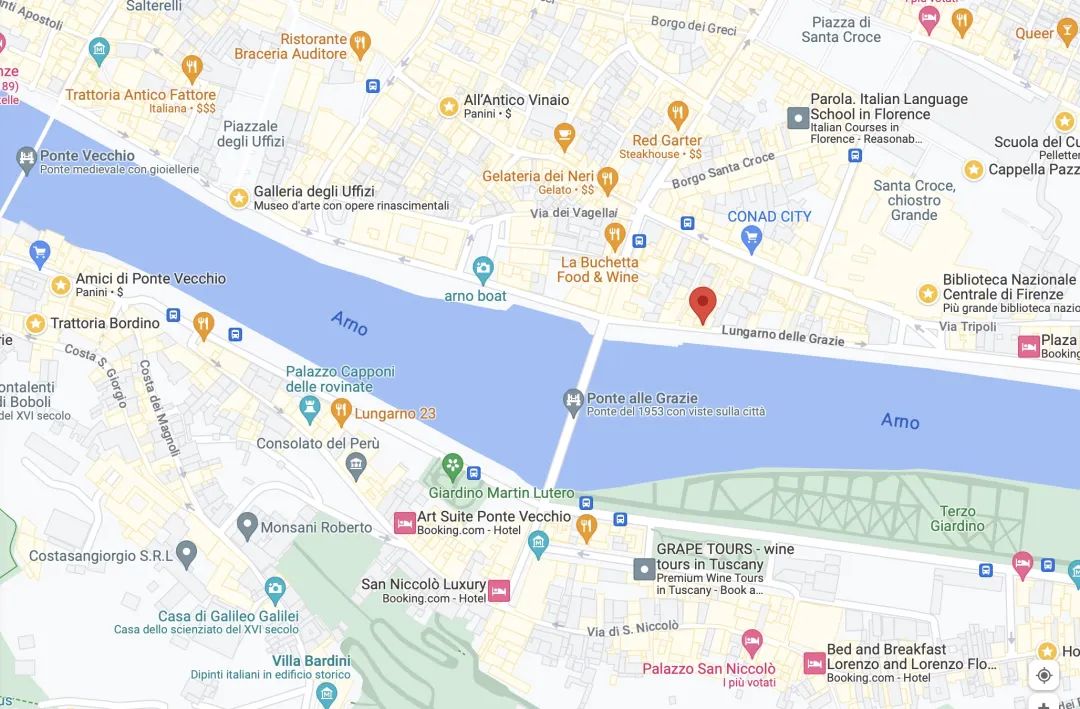 这个展览应该跟2019年也是由KHI和伦敦瓦尔堡研究所联合办的Ways of Seeing Florence. Archives, Autopsies and Art Historical Research in Italy around 1900有一定联系,与展览一起发布的还有一款APP Aby Warburg’s Florence,浏览者可以在软件上选择三条路线,通过GPS定位关联到相关的地点,然后会有相应的来自于20世纪的历史人物来解说瓦尔堡的研究细节。因为需要定位识别,只能推荐在佛罗伦萨的朋友试试看。关于这个展览,我根据网上的信息和近期为报告所做的资料搜索,稍微给大家提供一些导览。因为该展览是有展览画册的,也许有文章会谈到类似的问题,或者有档案材料的支撑,我这里只是根据我自己所了解到的信息,做一些推测的工作。首先是展览的标题:Camere con vista. Aby Warburg, Firenze e il laboratorio delle immagini,Rooms with a View. Aby Warburg, Florence and the Laboratory of Images。瓦尔堡1888年10月28日写信给母亲,其中透露自己租了一间在Lungarno delle grazie 20的房间,这个地方应该就在乌菲齐旁边,直接在Google Maps搜索(不太确定19世纪末与今天是否有变化),可以在地图上找到这个住处正好处于乌菲齐和佛罗伦萨国家图书馆中间(下图红点)。