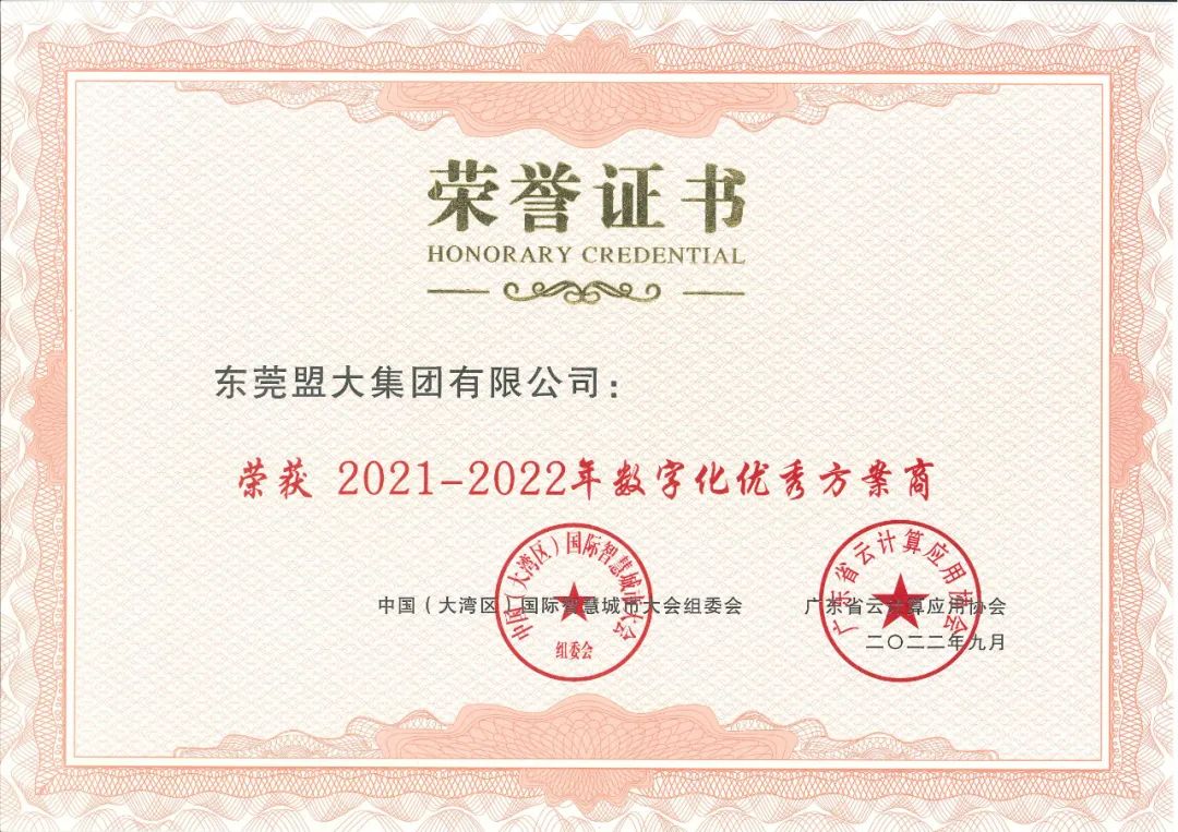 近年来,盟大集团在数字经济领域斩获的荣誉与成就颇丰,光2022年就荣获中国(大湾区)国际智慧城市大会“2021-2022年度数字化优秀方案商”“2021-2022年度智慧+行业应用场景创新案例奖”两项大奖,入选2022年东莞市首批数字化转型服务商名单等。