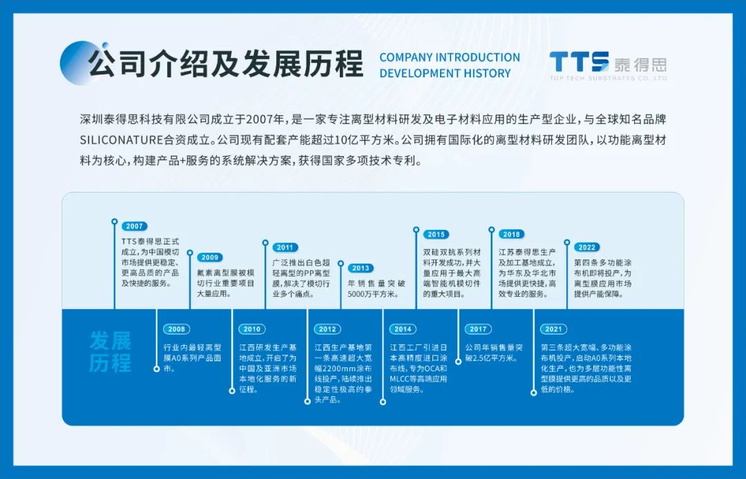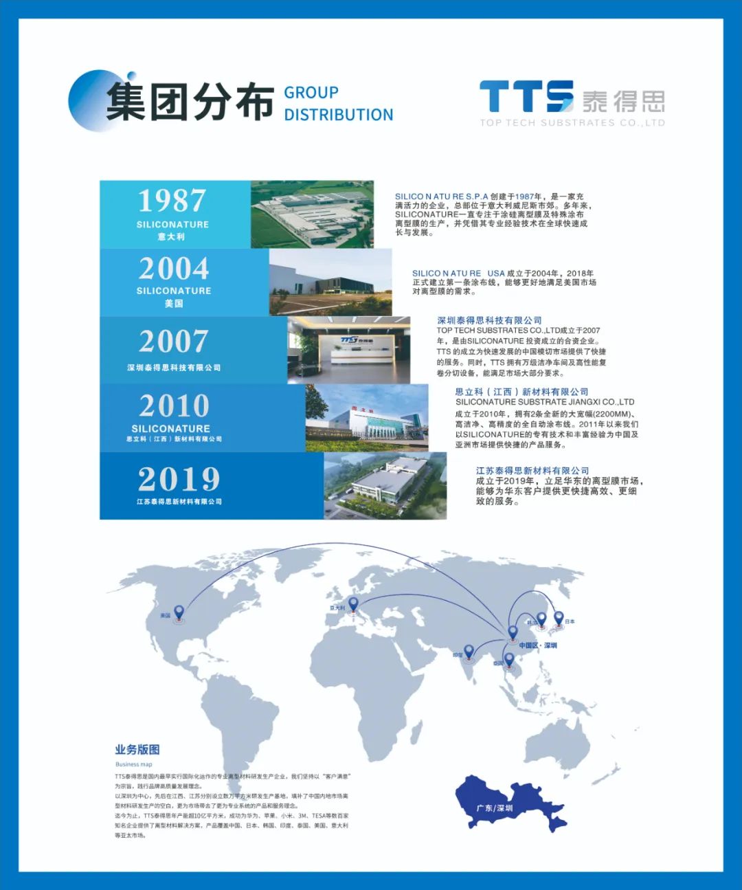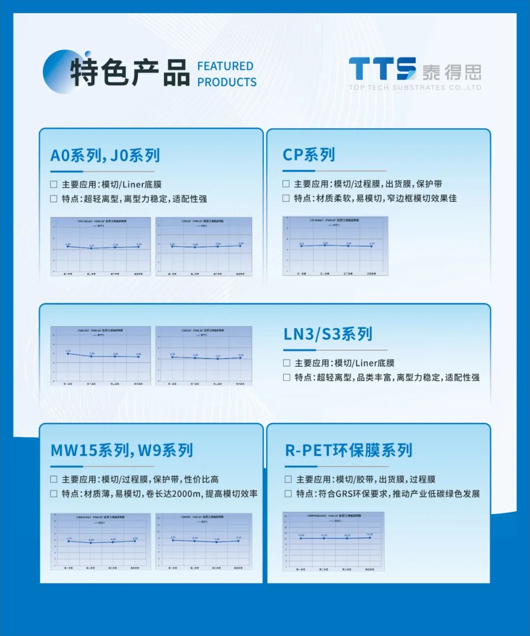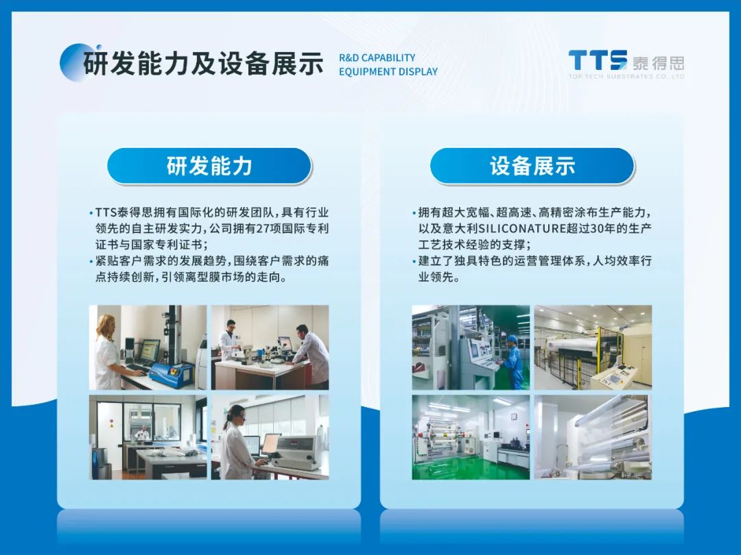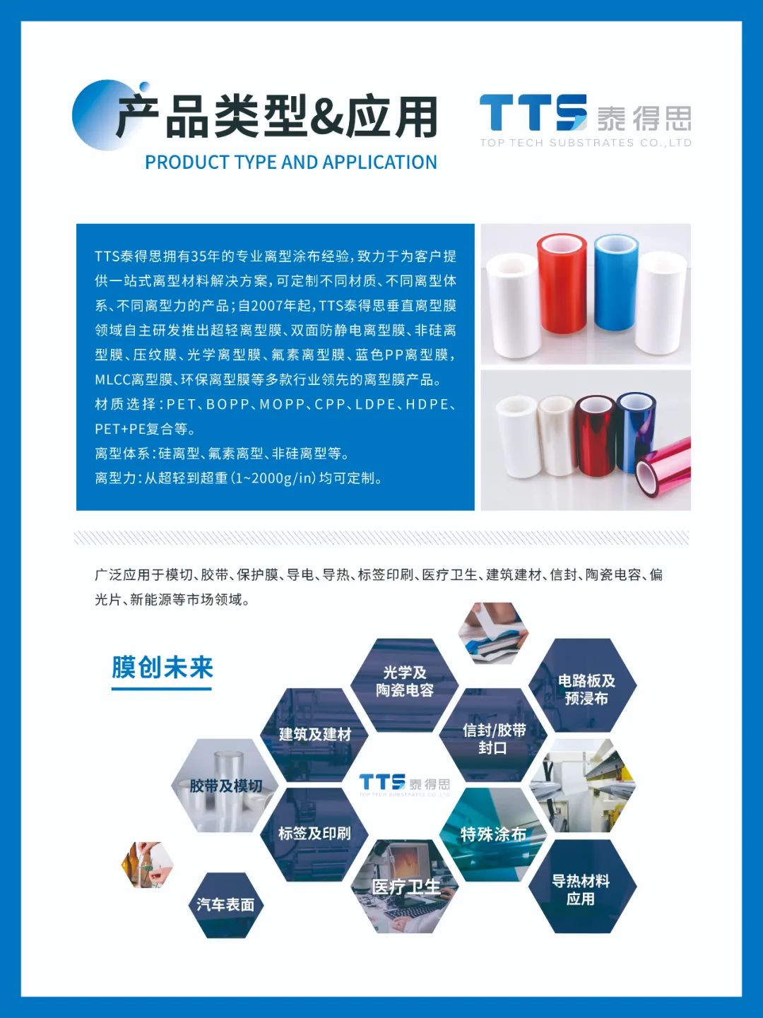 TTS泰得思(展位号4F35),成立于2007年,是一家专注离型材料研发及功能性膜材应用的生产型企业,与全球知名的离型材料品牌SILICONATURE合资成立。公司现有配套产能超过10亿平方米,公司拥有国际化的研发团队,以功能性离型材料为核心,构建产品+服务的系统解决方案,获得国家多项技术专利。