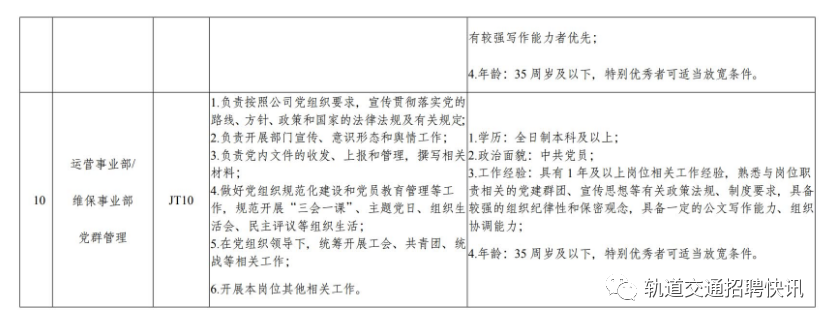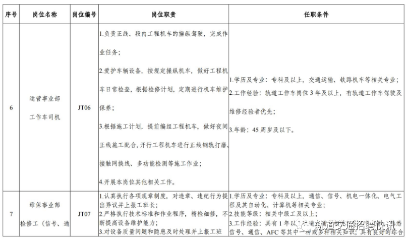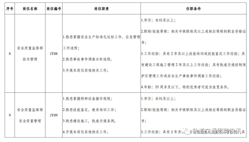 重庆江跳线轨道交通运营管理有限公司(以下简称公司)成立于2021年5月,主要负责市郊铁路(轨道交通延长线)跳磴至江津线(以下简称江跳线)的运营管理工作。江跳线始于轨道交通5号线跳磴站,止于江津区圣泉寺站,于2022年8月6日开通初期运营,是全国首条双流制市域(郊)铁路。为满足运营生产需要,经公司研究决定,现面向社会开展公开招聘,招聘公告如下:坚持公开、公平、公正和任人唯贤的用人原则,规范人才引进程序,营造人才发展的良好环境。(二)拥护中华人民共和国宪法,拥护中国共产党领导和社会主义制度。(五)具有岗位所要求的其他资格条件,详见招聘岗位所需任职资格条件与要求。(一)招聘岗位工作经验、年龄计算时间截止2023年9月。(二)曾因犯罪受过刑事处罚的人员、被开除中国共产党党籍的人员、曾被开除公职的人员、被依法列为失信联合惩戒对象的人员、有吸毒史的人员,以及法律规定不得录用的其他情形的人员,不得报名。招聘人员入职后与公司签订劳动合同,经试用期(3个月)考核合格后方可转正,工资福利待遇依据公司薪酬管理办法确定,并缴纳六险二金。1.网上报名时间:2023年9月28日09:00至2023年10月13日17:00,应聘者只能选择一个岗位报名,请在规定期限内上传个人准确报名信息。