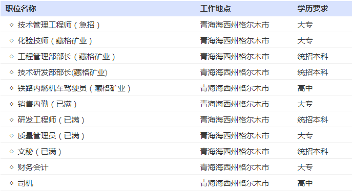 本公司所有招聘岗位面试地点:格尔木市黄河中路22号(格尔木藏格锂业有限公司)招聘职位列表: