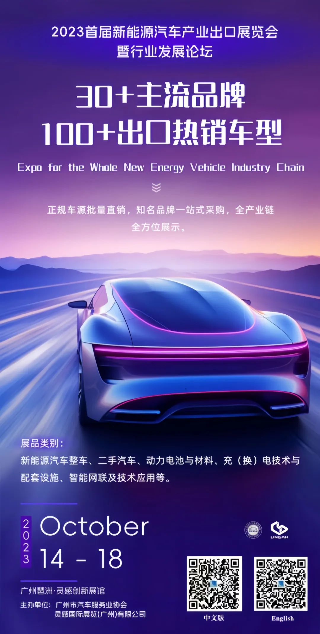 中国汽车产业正面临弯道超车的关键时刻,国际化舞台机遇和挑战并存,中国品已迎来“出海”的黄金时代。结合广州实际情况,打造汽车出口新引擎,加速广州汽车产业国际化发展,为我市汽车行业企业开展海外业务营造更加良好的环境,加快汽车产业“出海”步伐,广州市汽车服务业协会联合灵感国际展览(广州)有限公司于2023年10月14-18日在广州琶洲灵感创新展馆举办“2023首届新能源汽车产业出口展览会”。本次展会得到了广州市商务局、广州市工业和信息化局的大力支持,并作为活动指导单位。展会名称:2023首届新能源汽车产业出口展览会
