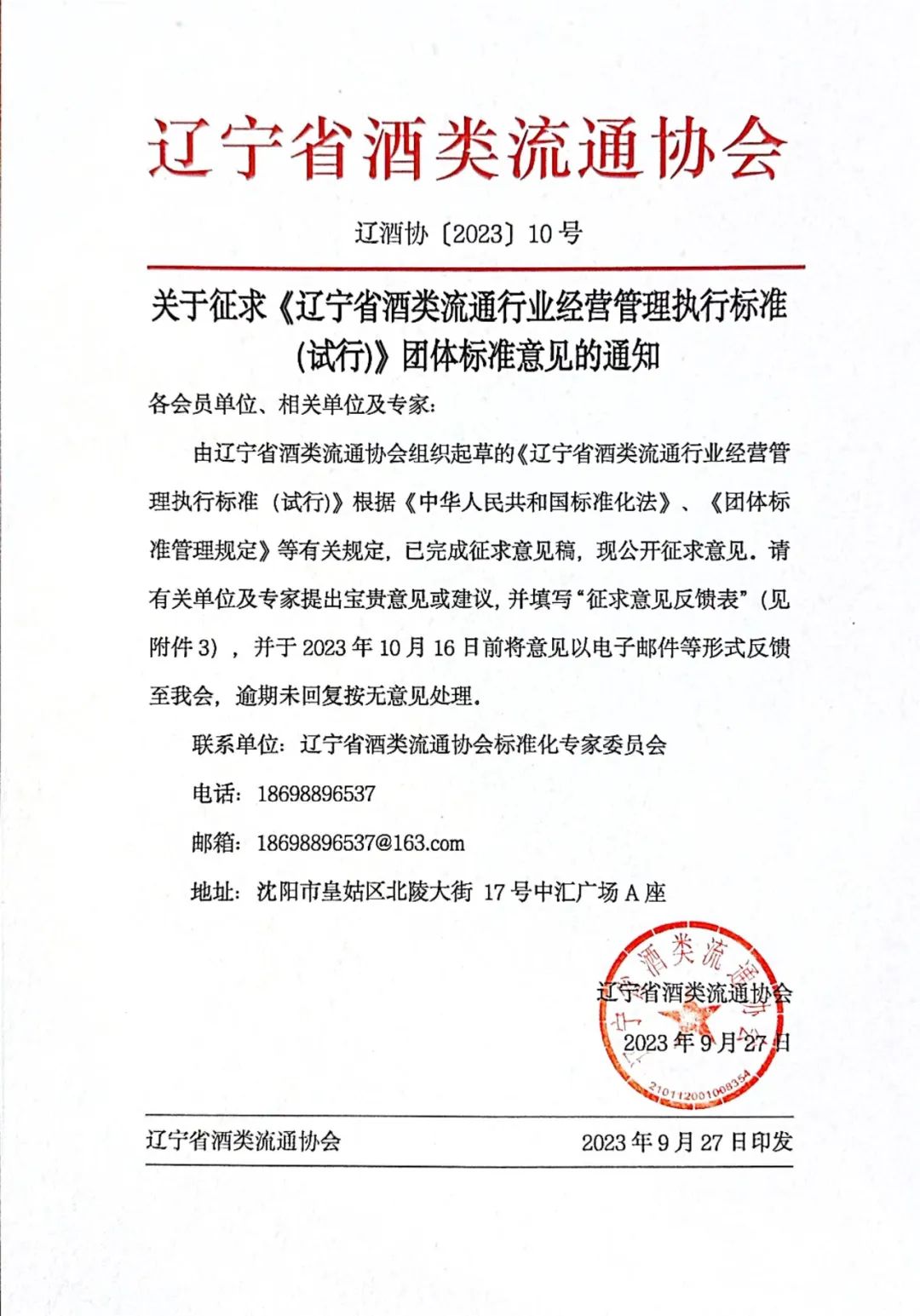由辽宁省酒类流通协会组织起草的《辽宁省酒类流通行业经营管理执行标准(试行)》,根据《中华人民共和国标准化法》、《团体标准管理规定》等有关规定,已完成征求意见稿,现公开征求意见。