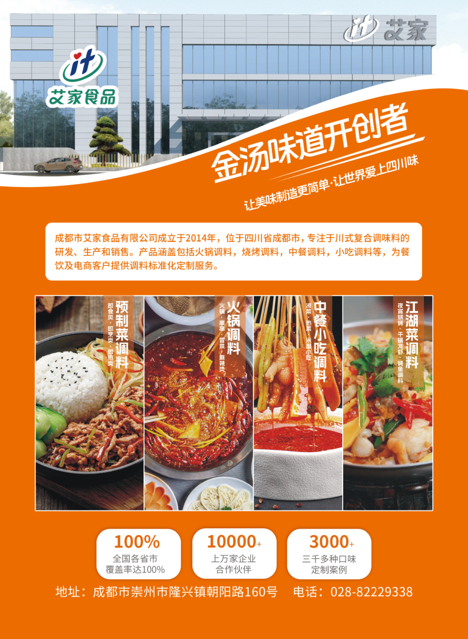 成都市艾家食品有限公司成立于2014年,经过多年的发展,目前在园区已有工厂占地面积近100亩,员工近500人,产品涵盖火锅、烧烤、中餐小吃复合调味料,高温低温预制菜,为餐饮及电商行业提供调料和预制菜标准化、个性化定制服务。