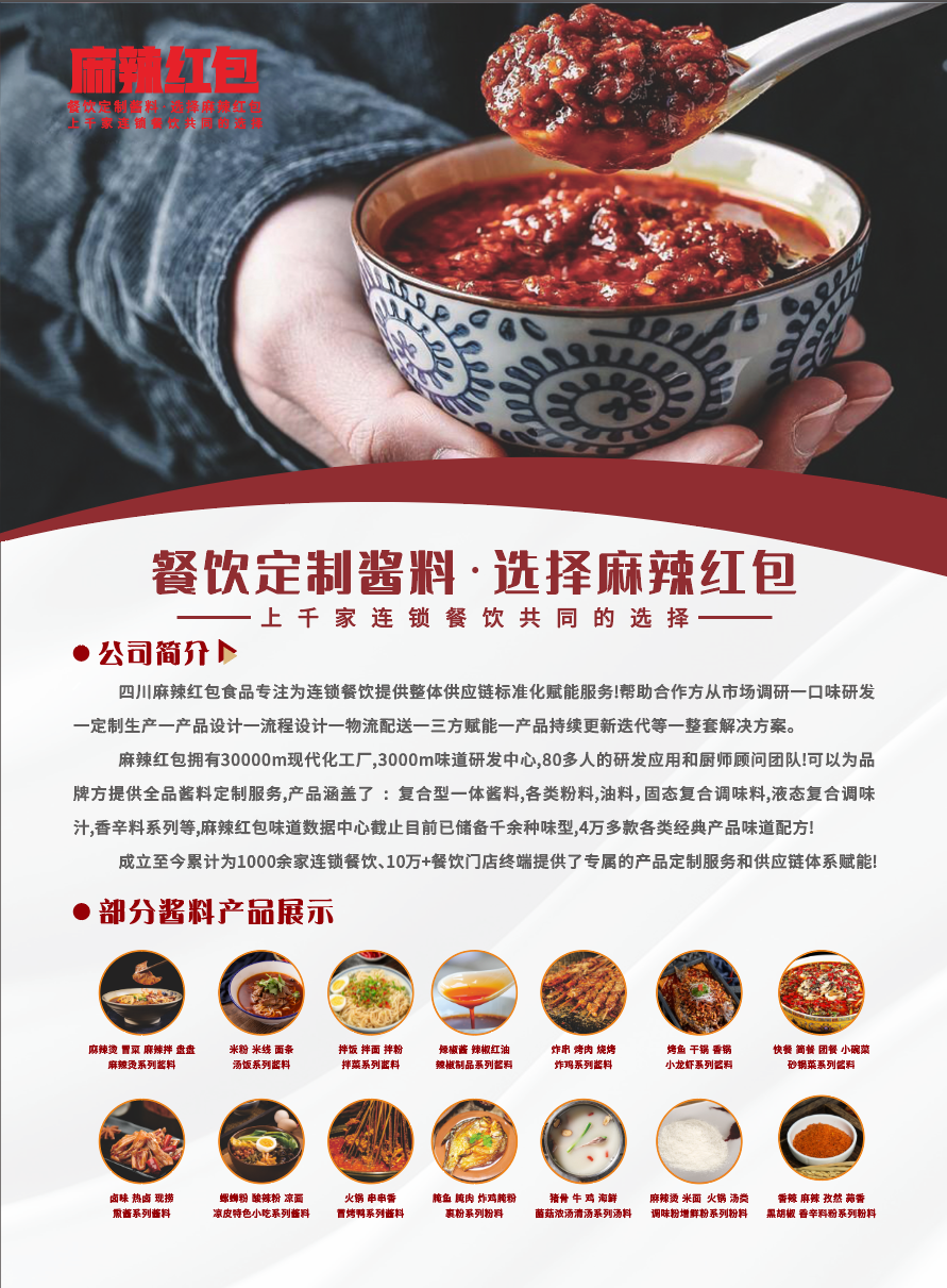 四川麻辣红包食品专注为连锁餐饮提供整体供应链标准化赋能服务!帮助合作方从市场调研一口味研发一定制生产一产品设计一流程设计一物流配送一三方赋能一产品持续更新迭代等一整套解决方案。