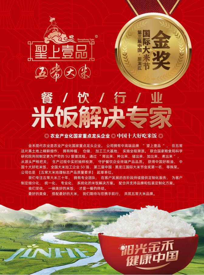 金禾现代农业是农业产业化国家重点龙头企业。公司拥有中高端品牌“望上壹品”,在五常这片黑土地上精耕细作,拥有种植、仓储、加工三大基地,实施全程溯源。联合国家粮食局科学研究院共同制定更为严苛的5U管理流程,通过“育出来、种出来、储出来、加出来、煮出来”,从源头严格把关,生产过程中实时抽样检测,守护餐饮企业终端产品品质。获得中国好粮油、中国十大好吃米饭、全国大米加工企业50强、第三届中国·黑龙江国际大米节金奖第一名、等殊荣。公司也是【五常大米地理标志产品质量要求】起草单位。
