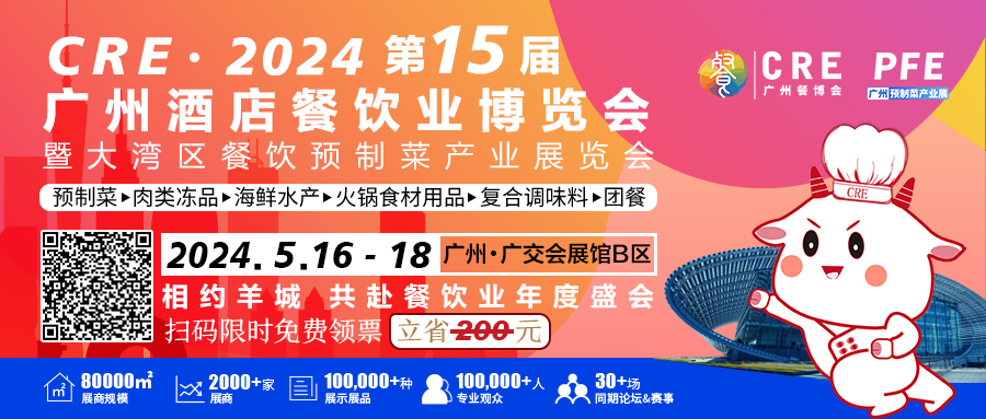 中国餐饮全产业链年度盛会——CRE·2024第15届广州酒店餐饮业博览会暨粤港澳大湾区餐饮预制菜产业展(以下简称:CRE广州餐博会),将于2024年5月16-18日在广州·广交会展馆B区举办!