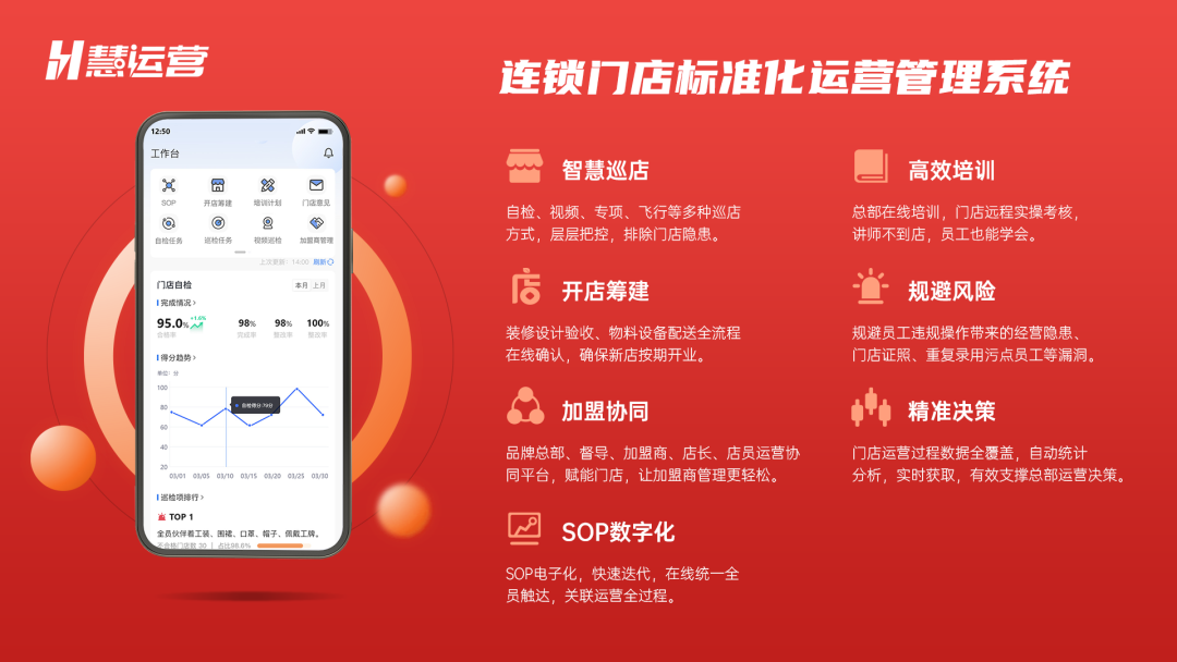 慧运营连锁门店标准化运营系统,致力打造“制定科学的SOP—训练与考核—巡检与辅导—分析与改善—优化SOP”运营管理的闭环路径,是品牌总部督导、培训师与加盟商、店长、店员运营协同平台,帮助连锁品牌提升持续盈利能力,加速复制。