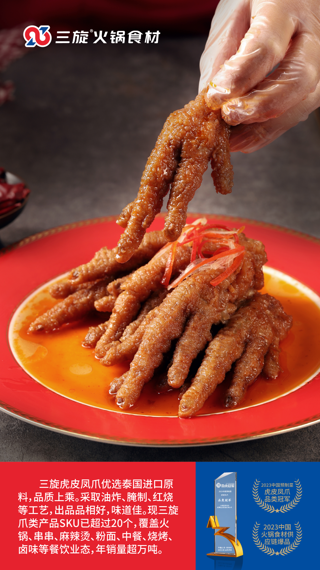 三旋创立于2017年,现已成长为专注火锅食材研发、生产与销售的集团化企业,中国泛火锅领域“虎皮凤爪”的开创者和“爪类”产品的领导品牌。