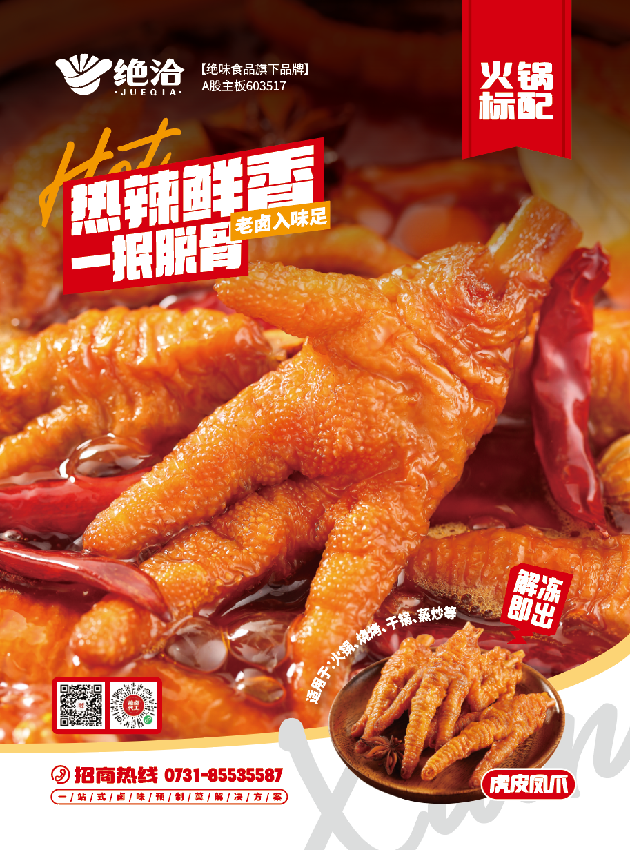 绝洽是绝味食品旗下专业从事B端卤味预制食材的供应链品牌,现有甜辣、香辣、麻辣、酸辣、五香等主推系列产品,涉及范围鸭及鸭副、鸡及鸡副、猪及猪副、牛及牛副、海鲜类、素菜类全品类........产品可应用于冷卤、热卤、卤炸、卤烤、蒸卤、卤炒、火锅、宴席等不同场景,满足不同类型客户场景应用及售卖需求。