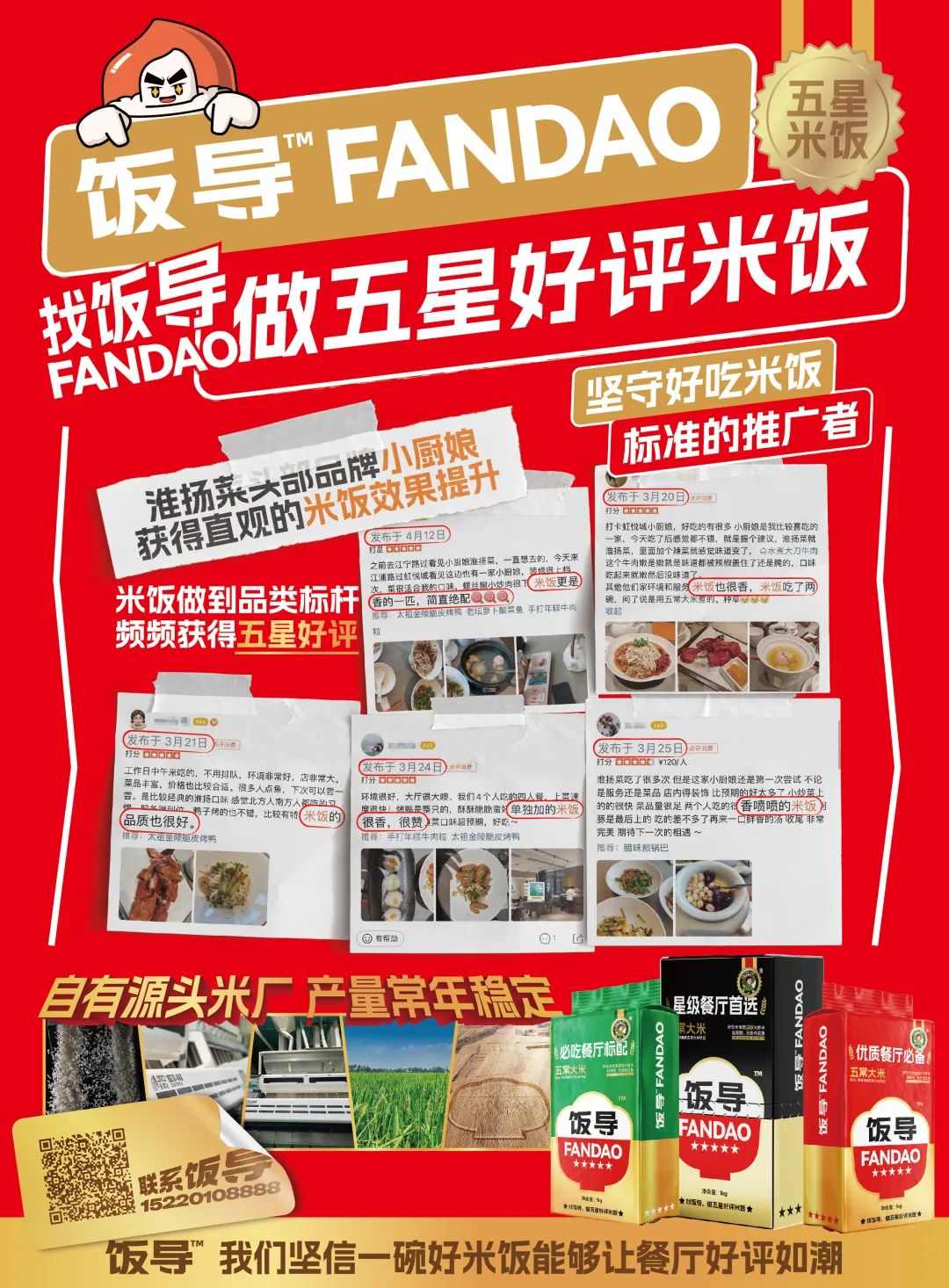 从五常大米1.0时代的大米贸易,到2.0时代的米饭烹煮指导服务,饭导首创五常大米3.0帮助餐厅做出真正的五星好评米饭,帮助餐厅围绕米饭产品进行营销以提高餐饮品牌美誉度以及影响力!