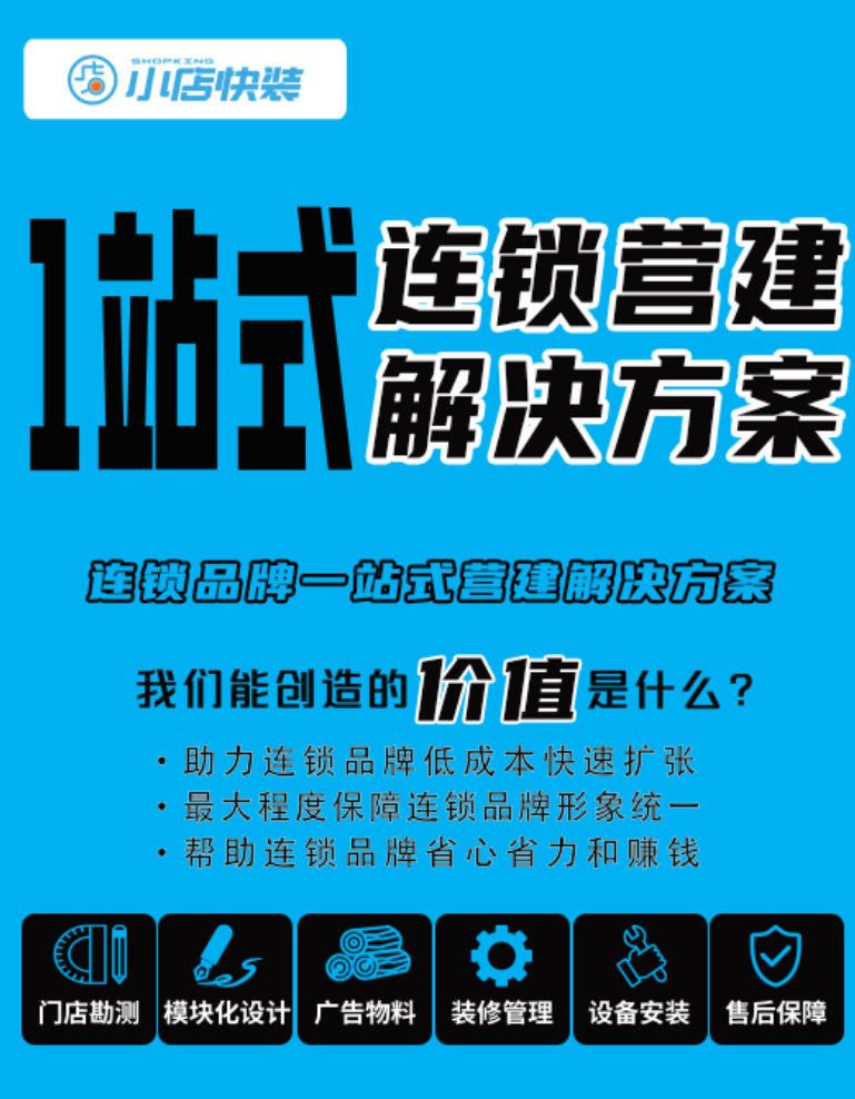 小店快装——专注一站式连锁营建解决方案,助力连锁品牌快速扩张。拥有超过15年实战经验的营建管理及项目管理团队。服务10多个行业领域、超100个连锁品牌,累计全国建店50000+家,覆盖全国1000+城镇。始终秉承透明、高效、平价的服务理念,致力为连锁品牌解决开店难、耗时久、成本高的痛点。