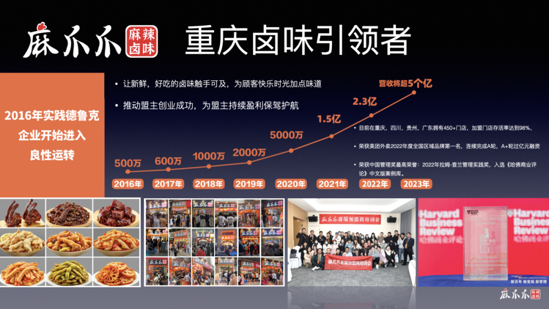 企业连续5年100%增长,疫情3年逆势增长26倍,全国门店数500+,获大望资本、番茄资本、金鼎资本、佳沃创投等多家国内知名机构两轮过亿元投资。推动300+位加盟商创业成功,获得2022年拉姆·查兰管理实践奖,案例入选《哈佛商业评论》中文版案例库。