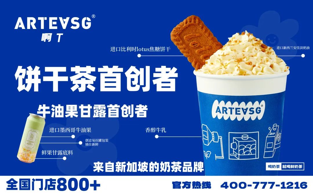 2017年将国内成熟的茶饮体系和文化输岀新加坡,在怡丰城开出首家旗舰店,并成立初创团队,ARTEASG品牌随之面世。其团队推岀“首创饼干茶”“牛油果系列”一经上市,受到广大消费者追捧。ARTEASG迅速蹿红新加坡成为不可多得的品质与颜值并存的网红奶茶品牌。