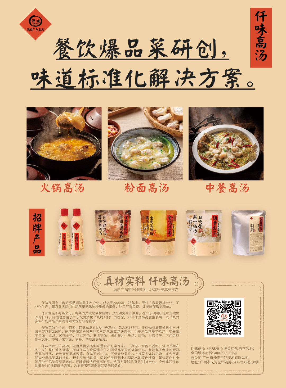 仟味是源自广东的高汤调味品生产企业,专注广东高汤标准化、工业化生产,将以前大厨们在厨房里熬汤这种难做的事情,让工厂来实现。23年来,仟味坚持真材实料熬高品质高汤,得到了五爷拌面、季季红、蒙自源、大师兄、蛙来哒、大米先生、老娘舅等2000+连锁品牌的信赖。主要产品涵盖鲜鸡汤、猪骨汤、金汤、酸辣金汤等等。