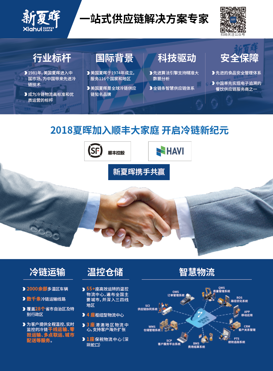 新夏晖深耕中国市场四十多年,采用全链条智慧供应链体系,拥有领先的多温度食品分发技术以及卓越的冷链供应链管理经验;一直以来,新夏晖不断创新开拓,构建先进的食品安全管理体系,是中国率先实现电子追溯的餐饮供应链服务商之一。通过科技赋能提高供应链规划、计划、执行和保障的能力,打通供应链全链。并不断向供应链上下游延伸,打造平台化的方案+智慧物流体系。保障了上万家知名餐厅的不间断运作。