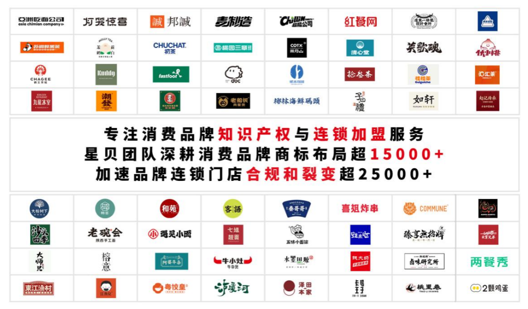 星贝知识产权是国内领先的知识产权创新思维综合服务商。五年来,基于对新趋势消费场景的洞察,立足“餐+饮”细分赛道,提供基于创新保护与领航发展的知识产权和连锁加盟服务。