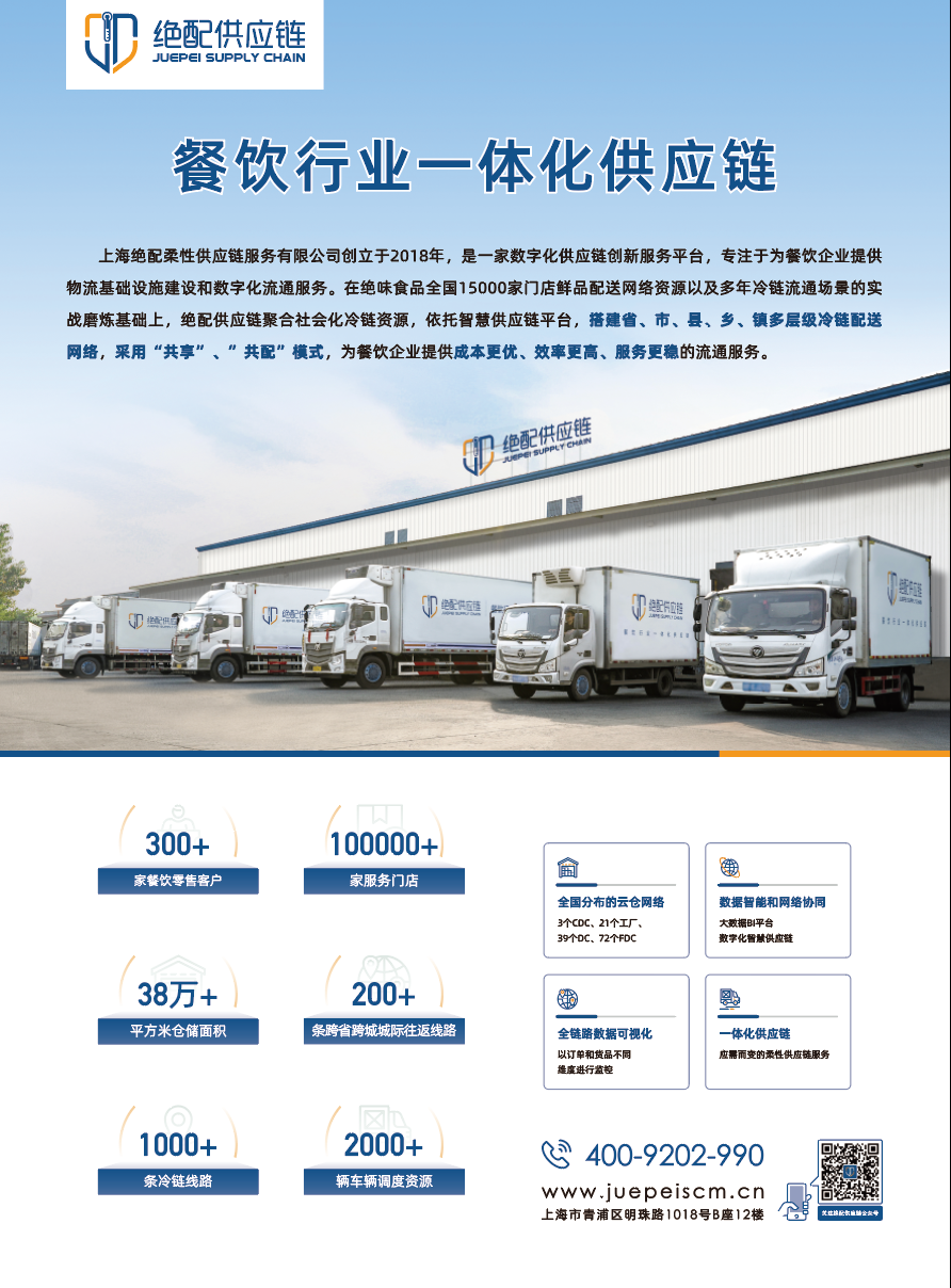 绝配供应链创立于2018年,是一家数字化供应链创新服务平台,专注于为餐饮企业提供物流基础设施建设和数字化流通服务。在绝味食品全国15000家门店鲜品配送网络资源以及多年冷链流通场景的实战磨炼基础上,绝配供应链聚合社会化冷链资源,依托数字化冷链技术平台,搭建省、市、县、乡、镇多层级冷链配送网络,采用“共享”、”共配”模式,为餐饮企业提供成本更优、效率更高、服务更稳的流通服务。
