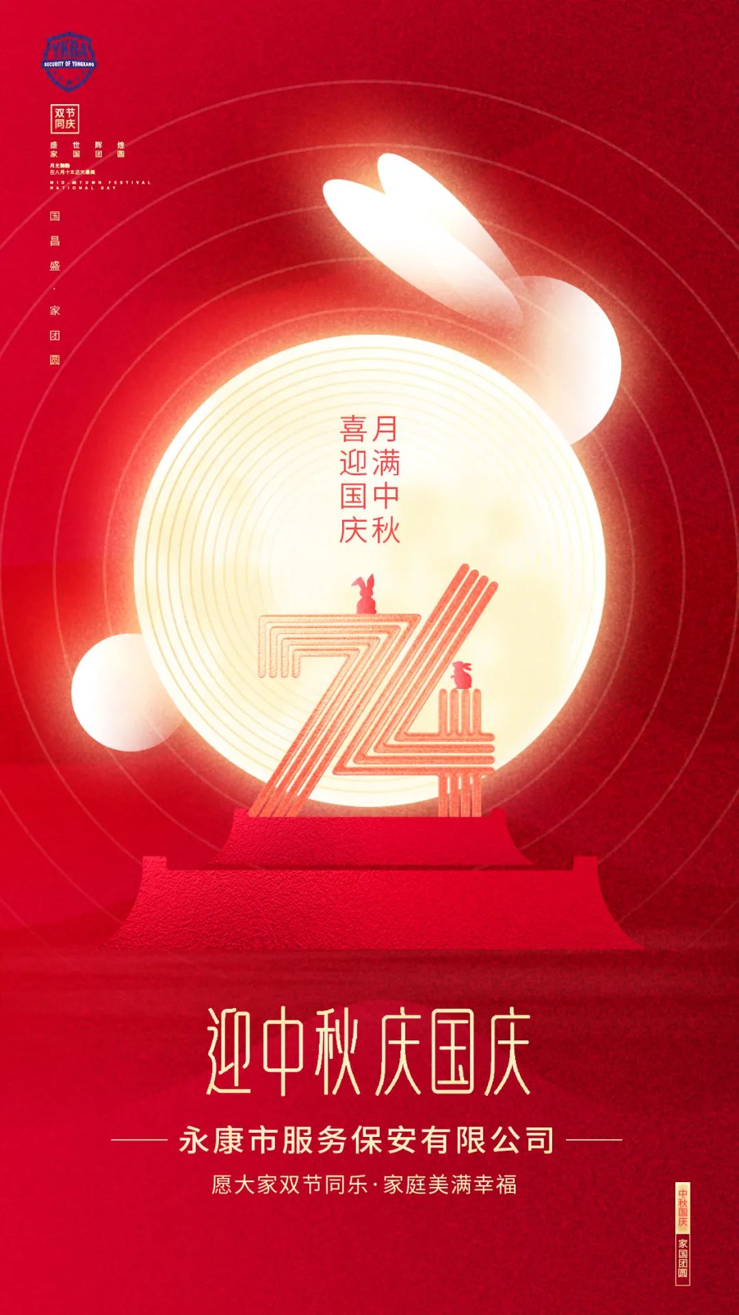 中秋、国庆佳节即将来临,在这举国欢庆、阖家团圆的日子里,永康市保安服务有限公司:祝福祖国繁荣昌盛,国泰民安;祝公司全体职工及家属阖家欢乐,幸福安康!