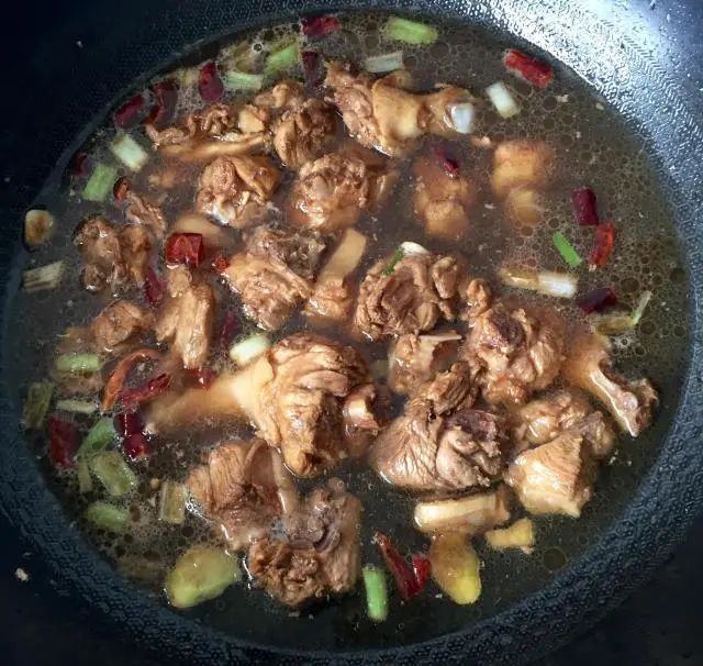 第3步:小火慢炖20~30分钟左右,锅中的啤酒基本上就差不多没了,这个时候用锅铲翻动一下鸭肉。随后在锅中放入少量的生姜片,生姜片能够压制鸭肉的一些腥味,让鸭肉吃起来更香。接着放入食盐,味精,料酒,老抽,蚝油等调味料翻炒均匀,开大火爆炒一下鸭肉,大概4~5分钟左右,撒上一些葱花就可以出锅啦,一道好吃又好看的啤酒鸭,就做成了。