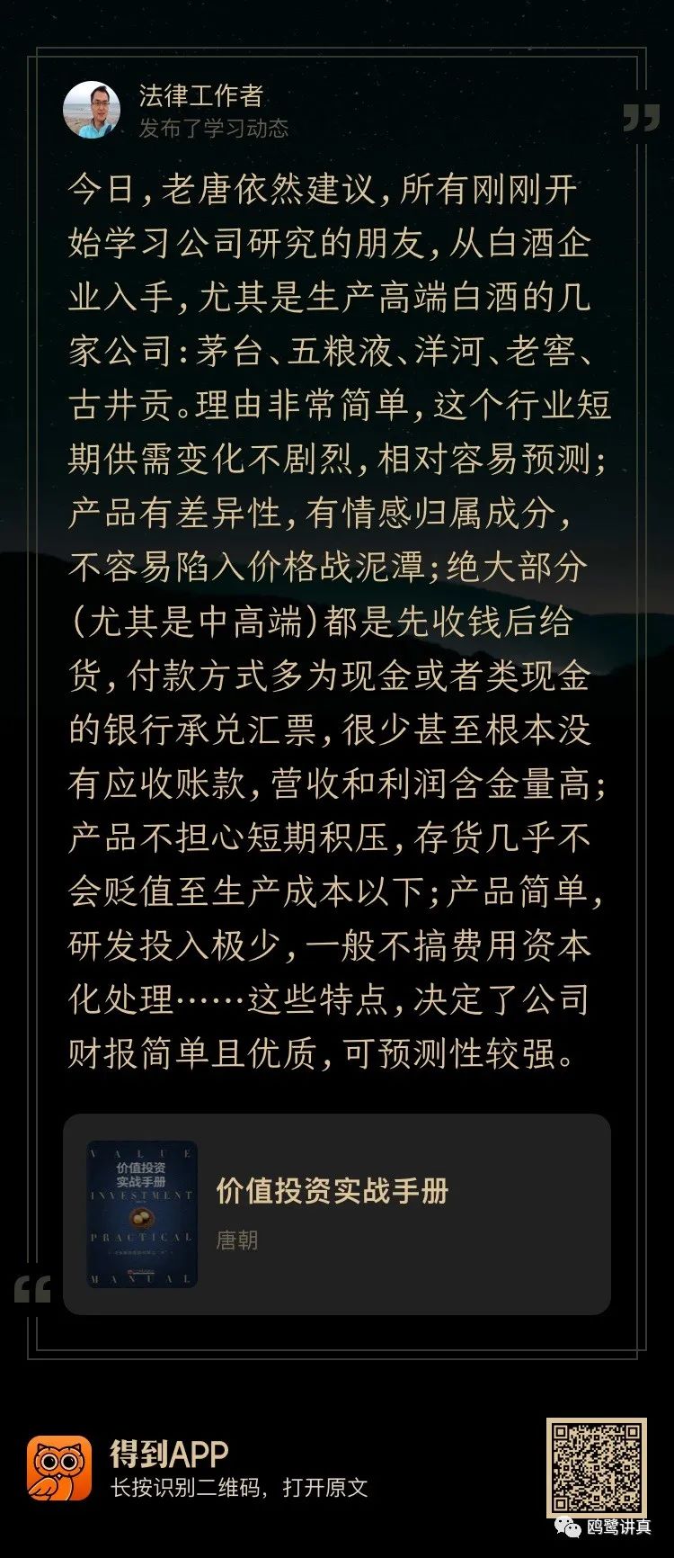 在《价值投资实战手册》中,老唐对白酒行业的特点进行了归纳: