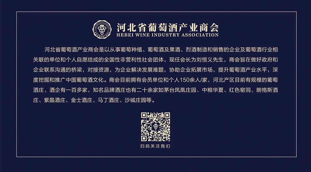 成立于2022年,河北省葡萄酒产业商会以葡萄种植、葡萄酒果酒烈酒制造和销售的企业、及葡萄酒行业相关的单位和个人集结成的全国性非营利社会团体。河北葡萄酒产区已有800年的历史,得天独厚的位置使河北的红酒产业蓬勃发展。