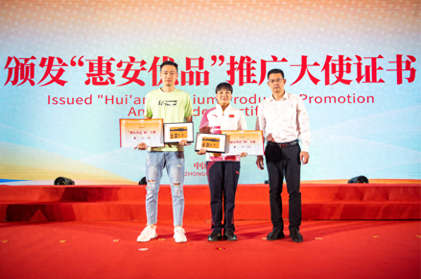 向奥运冠军张楠、世界冠军李妮娜颁发“惠安优品”推广大使证书。邓文祥 摄