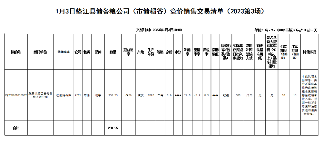 受重庆市垫江县储备粮有限公司委托,重庆市粮油批发市场有限责任公司(即国家粮食重庆交易中心,以下简称“批发市场”)定于2023年1月3日10:00举办垫江县储备粮公司(市储稻谷)竞价销售交易会,现将有关事项公告如下:2. 产地、年限及数量:重庆2020年产稻谷250.95吨。3. 承储库点及仓号:垫江澄溪储备库2P05号仓(原2P21号仓)。4. 标的质量:以交易清单质量指标为准。有意向参与交易的会员可通过“重庆粮网”(www.grainmarket.com.cn/centerweb/region/CQ)、“重庆粮食集团”官网(www.cqgrain.com)→资料下载→《竞价销售粮油看样单》路径,填写后加盖公章邮寄或扫描至批发市场,经批发市场审核盖章后,提前实地查看粮食实物质量和路况、出库条件等情况,确保所竞买的粮油符合自身使用用途,自主确定是否购买,并承担竞买后相应责任和市场风险。如未提前看样或看样后参与交易的,均视同认可标的质量,成交后不得再对质量提出异议。5. 本次交易清单附后。具体交易品种和数量等信息如有变化,以即时公告及交易清单为准。1. 报名资格:国内具有粮油生产、经营资格的企业或个人且在国家粮食交易平台注册的有效会员。2. 报名时间:2023年1月3日8:00前。报名参与交易即视作全面承认并遵守《重庆市地方政府储备竞价销售交易规则》和交易公告、交易清单等要求。1. 本次竞价交易使用国家粮食交易平台地储交易系统,2023年1月3日10:00通过网络对委托标的依次按交易节进行交易。请报名参加竞价交易的会员按时登录国家粮食交易中心官网(www.grainmarket.com.cn)→点击网页上方“请登录”或右方“用户中心”进行会员登录→点击“交易”板块→选择“重庆市场”→“1月3日重庆市地方储备粮(垫江稻谷)竞价销售交易专场”。1. 保证金的收取和释放:参与竞价交易的买卖双方各须交纳保证金110元/吨(其中:履约保证金100元/吨和交易保证金10元/吨)。买方保证金须在竞价销售交易会开始前2个小时汇至批发市场指定银行账户;卖方保证金须在提交委托交易清单当日汇至批发市场指定银行账户。单笔合同交割完毕后,保证金释放。如合同部分交割,该合同数量的所有保证金处于冻结状态。2. 保证金转入:汇款时请备注“保证金”,待资金到账后,进入系统“用户中心”的资金界面,点击用户名称下方的“交易账户:明细”,将足额保证金“转入”重庆市场。3. 交易手续费:按成交金额的1.5‰向买方收取。1. 成交价格:为交易系统确认价格,即卖方承储库仓(罐)前散装车板交货价格,不含包装及整理费用,无出库费,无水、杂增扣量。如买方有包装以及整理要求,可与卖方协商,费用按照协商一致的标准另行结算。2. 合同签订:自成交之日起3个工作日内买卖双方在交易系统内签订电子购销合同或以邮寄、扫描等方式签订,如逾期未签订购销合同,则对违约方作违约处理。3. 付款及出库:买方自成交之日起10日内付款完毕,15日内出库完毕。买方成交后将货款一次或分批汇入批发市场指定银行账户。出库前,买方在“我的合同”中点击“支付货款”来完成出库通知单申请。批发市场收到申请后,及时审核并开具《出库通知单》。4. 结算:出库完毕后买卖双方签订《验收确认单》,由卖方送达批发市场,批发市场在2个工作日内按《验收确认单》办理货款结算。2. 开户银行:中国农业银行股份有限公司重庆九龙坡中梁山支行 3. 账 号:31-0707010400088881. 本次交易规则详见“重庆粮网”(www.grainmarket.com.cn/centerweb/region/CQ)、“重庆粮食集团”官网(www.cqgrain.com)《重庆市地方政府储备竞价销售交易规则》,与此规则不一致的以本次公告为准。2. 会员在交易前到委托方存储库点看样或成交后到委托方存储库点提货时,需遵守当地的疫情防控政策,做好疫情防控工作。3. 本批次粮食出库后,买方不得将其作为政策性粮食重新销售给收粮单位入库,否则一切不良后果和法律责任均由买方承担。4. 各会员单位发现以陈顶新、转圈粮、套取财政补贴、人为设置障碍造成出库难、不执行出库质量检验制度等违法违规问题的,请拨打12325举报。5. 市场交易部联系电话:023-65269777 023-65269283