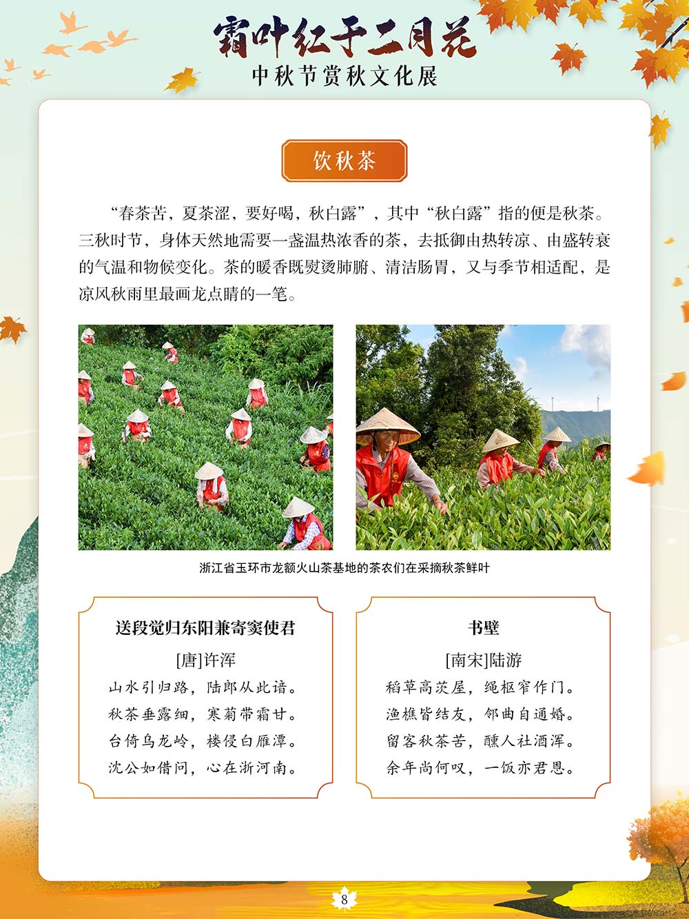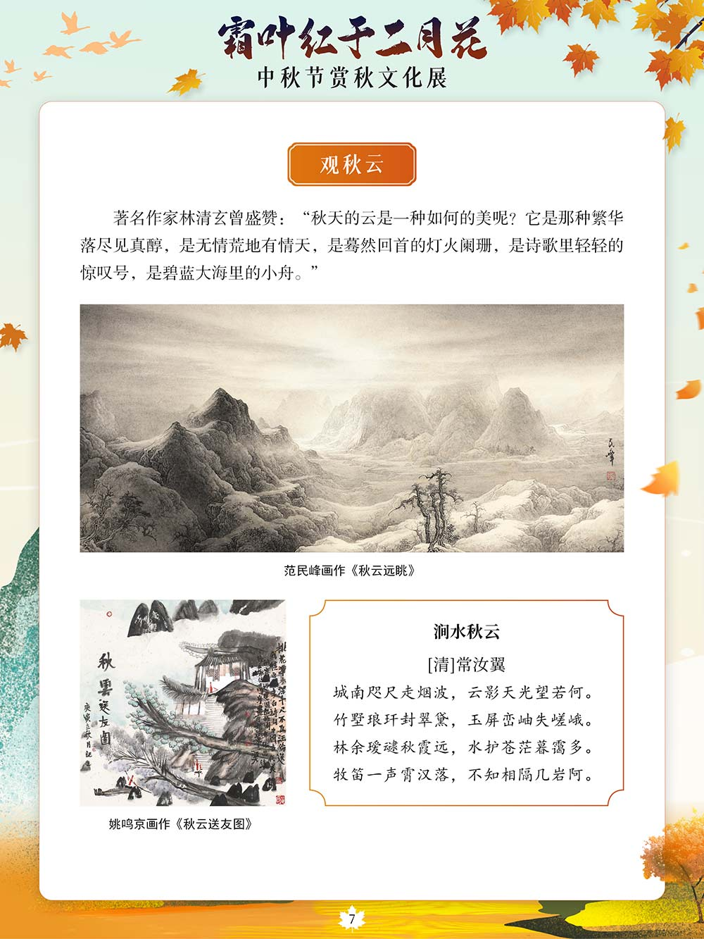 皓月当空,丹桂飘香。作为沿袭千年的传统节日,中秋节始终承载着月圆人团圆、平安合家欢的朴素观念。中秋习俗中,赏秋文化源远流长,自古就有“玉露金风满桂枝,清光因此更华滋”的赞美之词。赏秋作为一种文化传统,已经成为国人生活中不可或缺的一部分。为迎接中秋节的到来,我们特别策划了“霜叶红于二月花——中秋节赏秋文化展”,通过“古代赏秋文化活动”“现代赏秋文化活动”“中秋赏秋色胜地”等几部分,介绍古今赏秋文化与习俗,展现大美中国文化之美、山河之美。