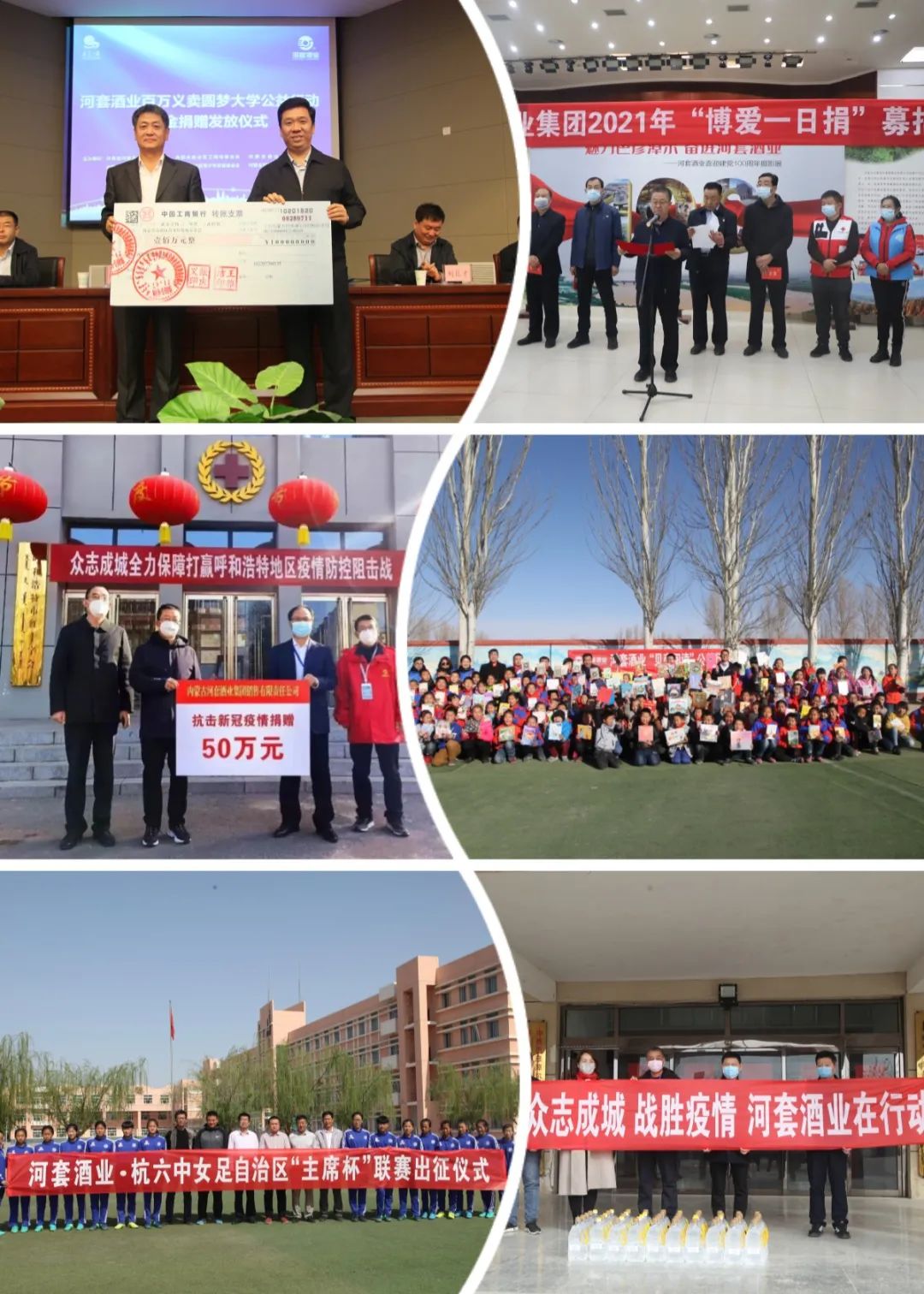 河套酒业集团在自身发展的同时,不断传递品牌温度,企业积极参与地方及国家开展的各项社会公益活动,从不间断,通过开展抗灾救助、爱心助学、助力乡村振兴等多种方式践行社会责任担当,尤其在抗击新冠疫情期间,企业持续捐款和捐赠防控物资达600多万元。近十几年来,河套酒业集团累计上缴国家税金超过60多亿元,累计社会公益捐助超过1.5亿元。