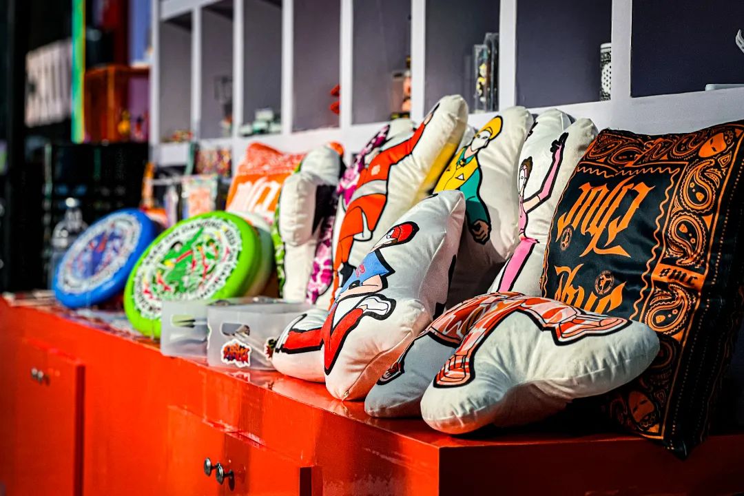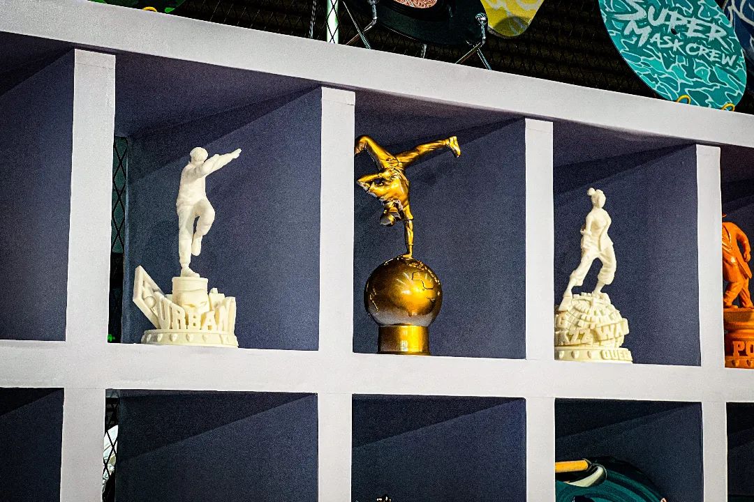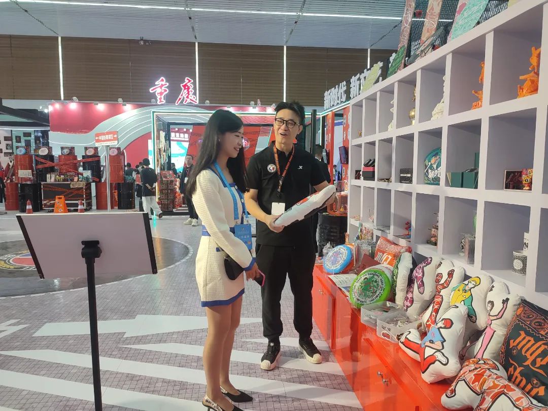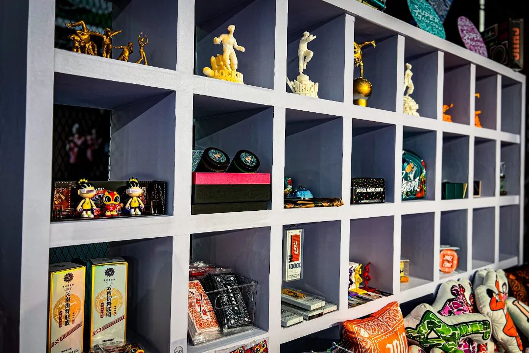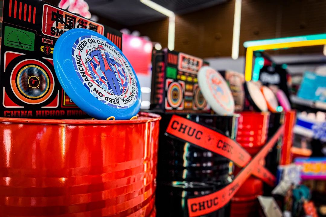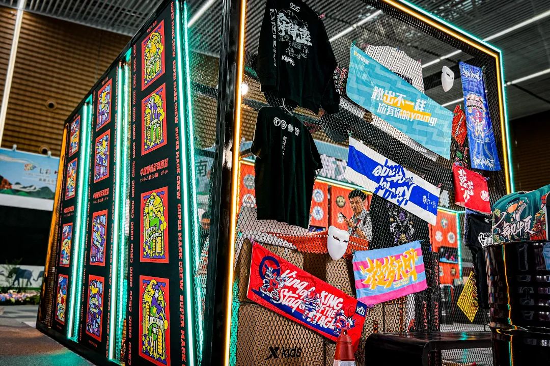 琳琅满目的街舞周边文创产品区,让很多观众流连忘返。栩栩如生的精致手办、富有特色的毛绒制品、同潮流文化与街舞结合的贴画、飞盘、滑板等等产品摆放在一起,让人目不暇接。全国各地街舞联盟也带来了很多如街舞联名的饮品、茶叶、展牌等等含有地方特色的周边进行展示,充分展现着中国街舞产业在艺术文创领域的繁荣发展。