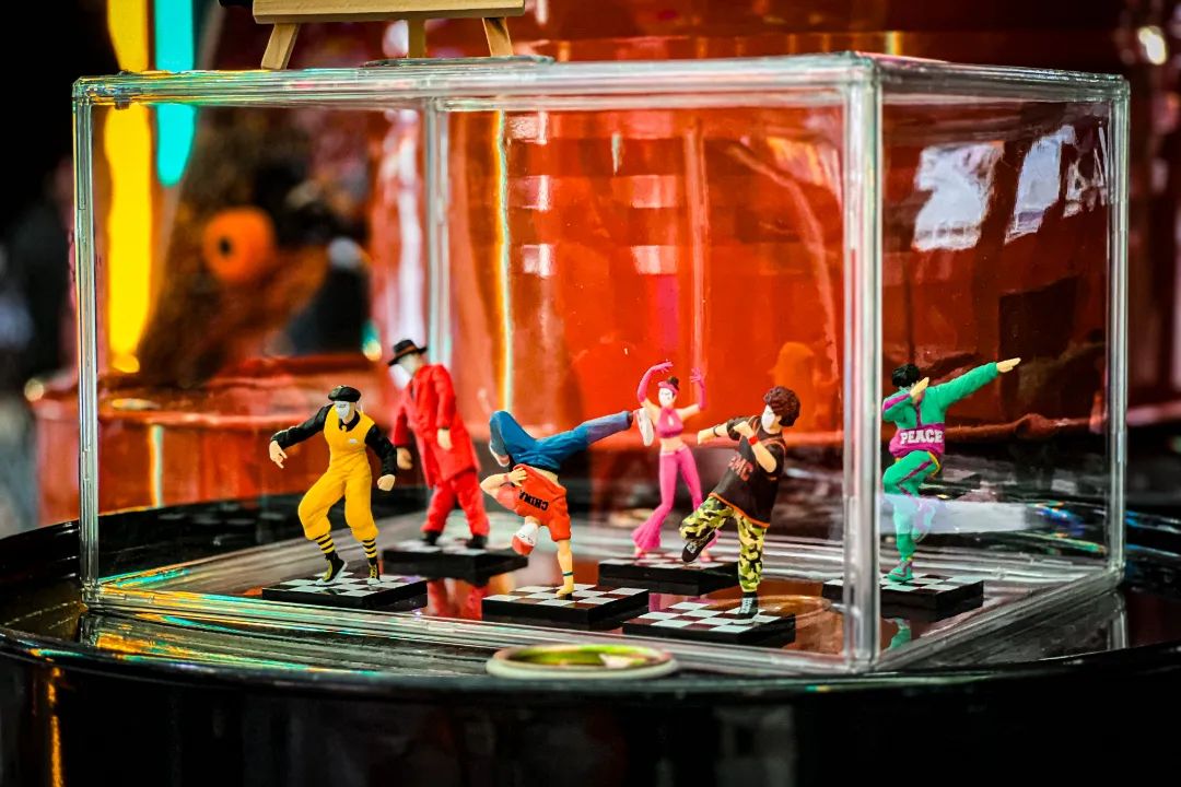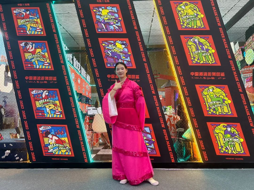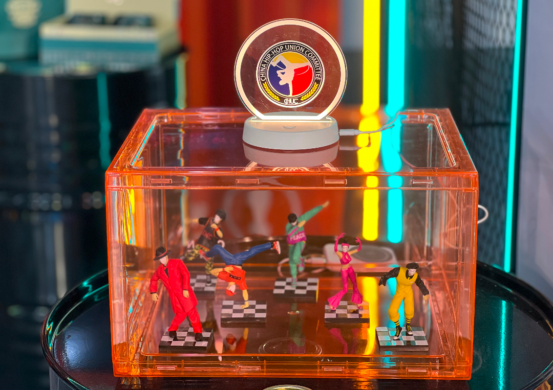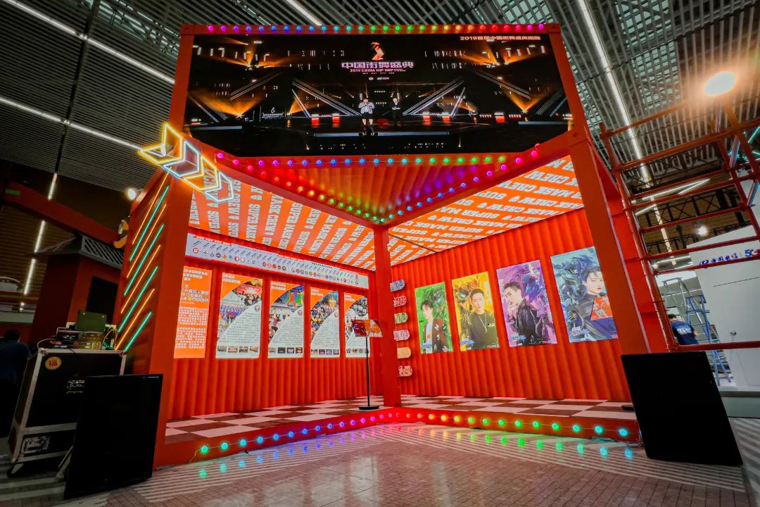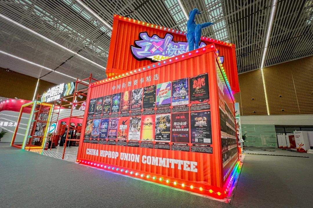 “中国街舞”展区主要分为九个部分,包括演艺、文创、产业、街舞独立项目,街舞元宇宙,雕像互动打卡等。主题设计以集装箱为基础,配合灯光,大屏等进行布展,打造出赛博朋克风格,突出街舞的潮流时尚。