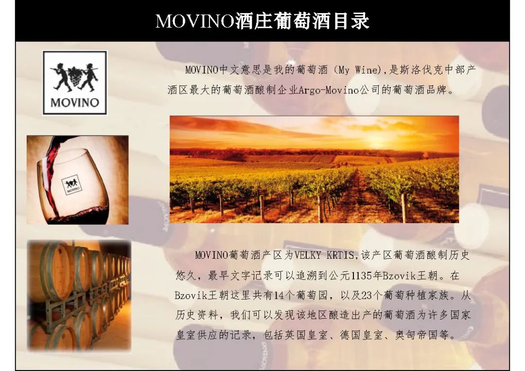 MOVINO英文意思是My Wine,他是斯洛伐克中部产酒区葡萄酒酿制企业Argo-Movino公司的葡萄酒品牌。MOVINO葡萄酒属于原产地控制的葡萄酒,产区为VELKYKRTIS.该产区葡萄酒酿制历史悠久,MOVINO葡萄酒品种丰富。尽管斯洛伐克葡萄酒不如法国、意大利等葡萄酒出名,但是其特别的土壤和气候条件种植出来的葡萄品质好,酿制的葡萄酒是原来奥匈帝国王室和其他东欧国家王室的收藏葡萄酒。