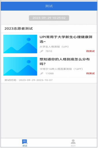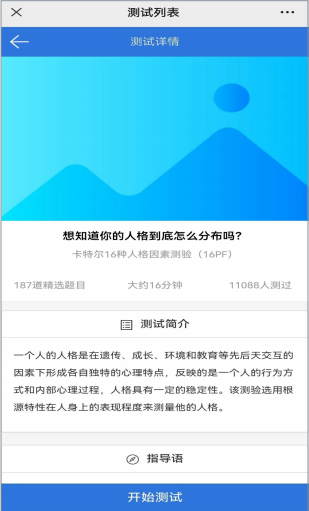 在测试首页选择“测试主题”,点击进入“开始测试”,共两个测试,测试时长约20-30分钟。