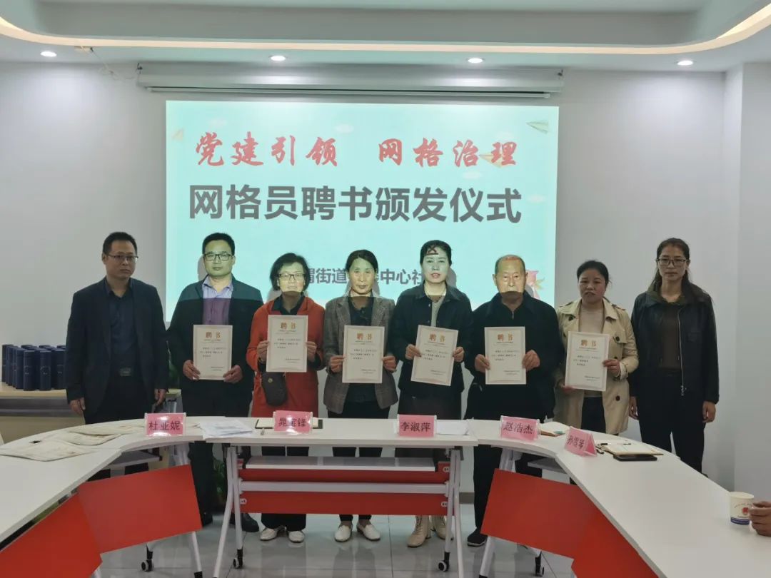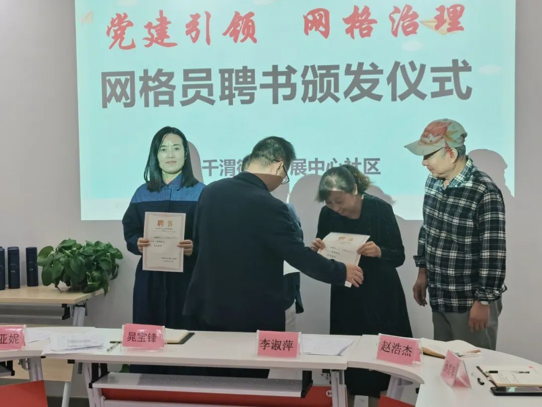 会上,由社区党支部书记、居委会主任李淑萍介绍了社区“四级网格”体系和“四级网格”党组织体系。接着,明确了各网格员的职责,一要做到带头联系服务居民,动态掌握楼栋居民基本情况,及时向网格党支部反映并做好跟踪;二要带头参与小区治理,引导党员、居民积极参与协商议事等业主自治活动,主动调解邻里纠纷,配合社区工作;三要带头弘扬文明新风,协助开展文明城市创建等工作;四、带头参加党内活动,鼓励在职党员参与楼栋党小组党建活动。最后,社区为各网格员颁发了聘书。