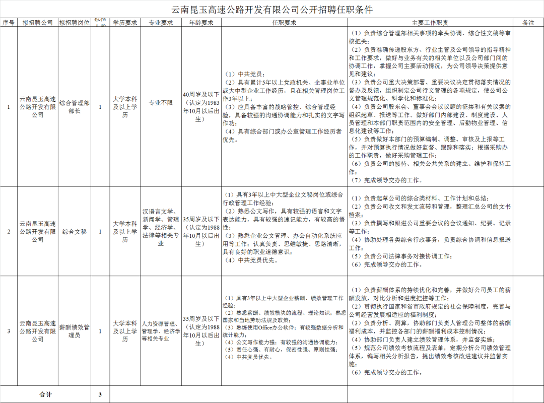 综合管理部部长1名、综合文秘1名、薪酬绩效管理员1名。(岗位具体资格条件详见附件1)。