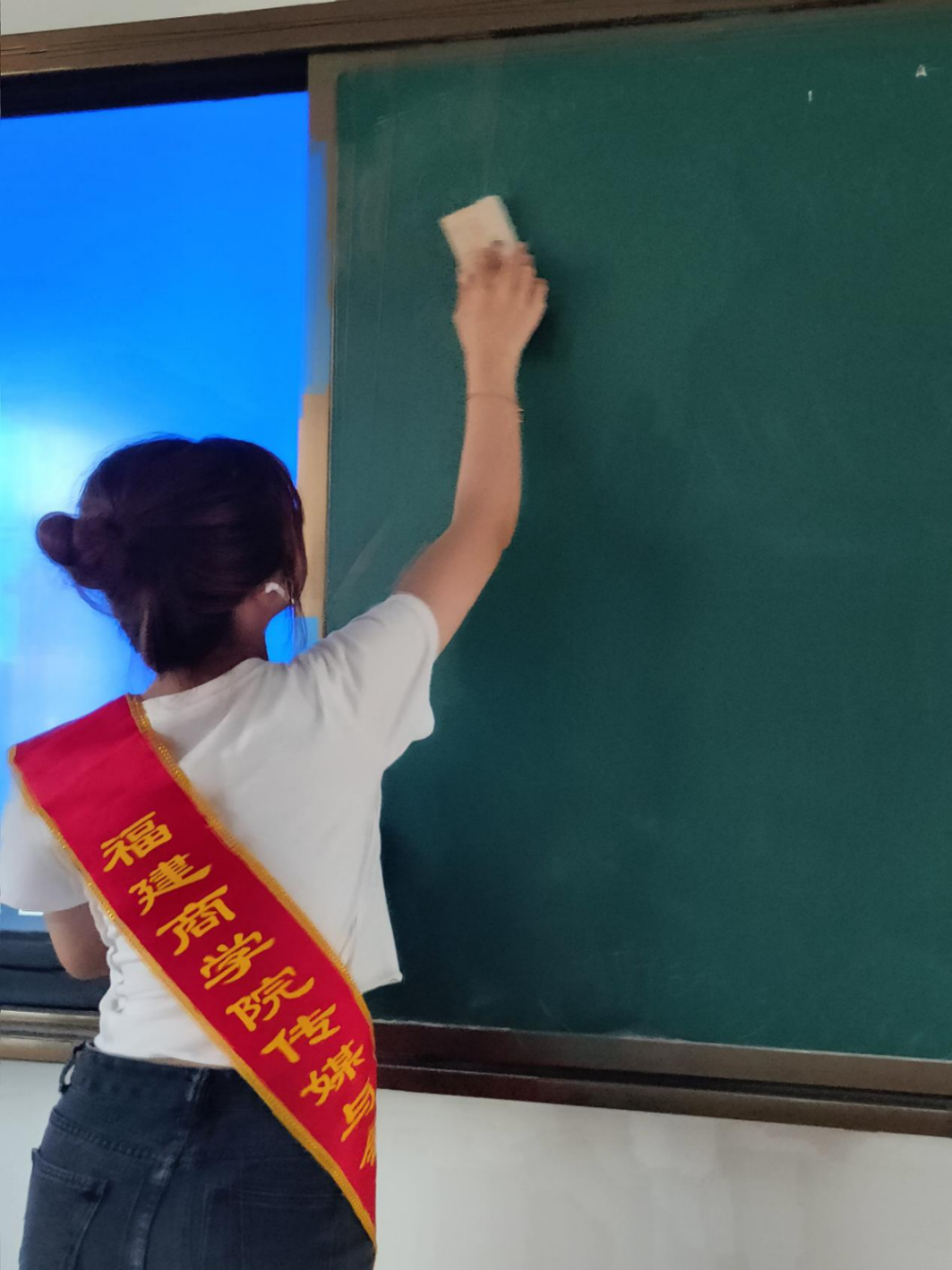 参与文明教室活动的志愿者们对各个教室进行了打扫,如摆置座椅、擦拭黑板等,在志愿者们的不懈努力下,一间间教室变得干净整洁,书桌摆放也变得井然有序。